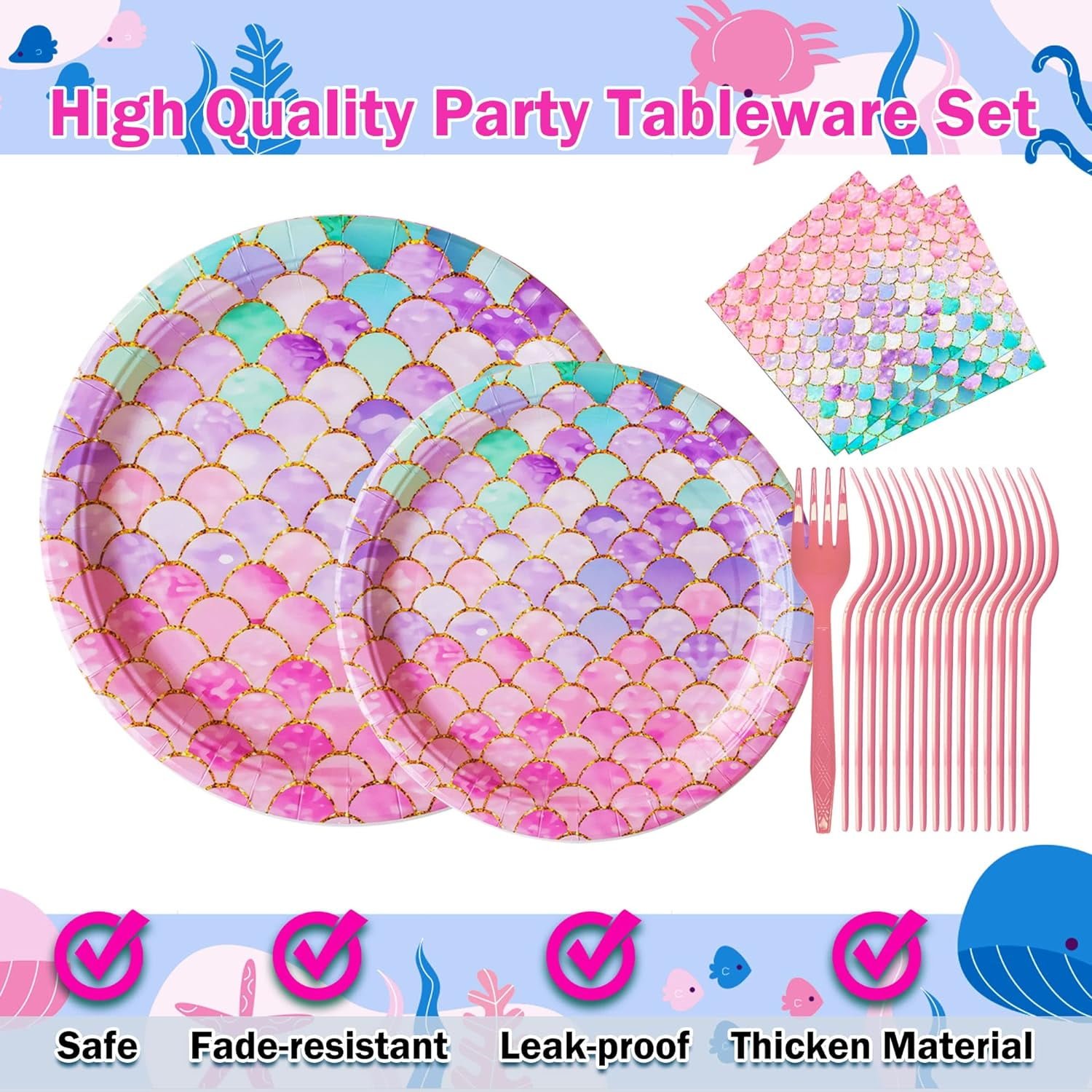 - 【Premium Materials】: Our Mermaid Party Supplies dinnerware set made of thickened quality paper and plastic, no smell, safe and durable, will not easily fold, teared or broken when carrying food. Prefect for desserts, party food