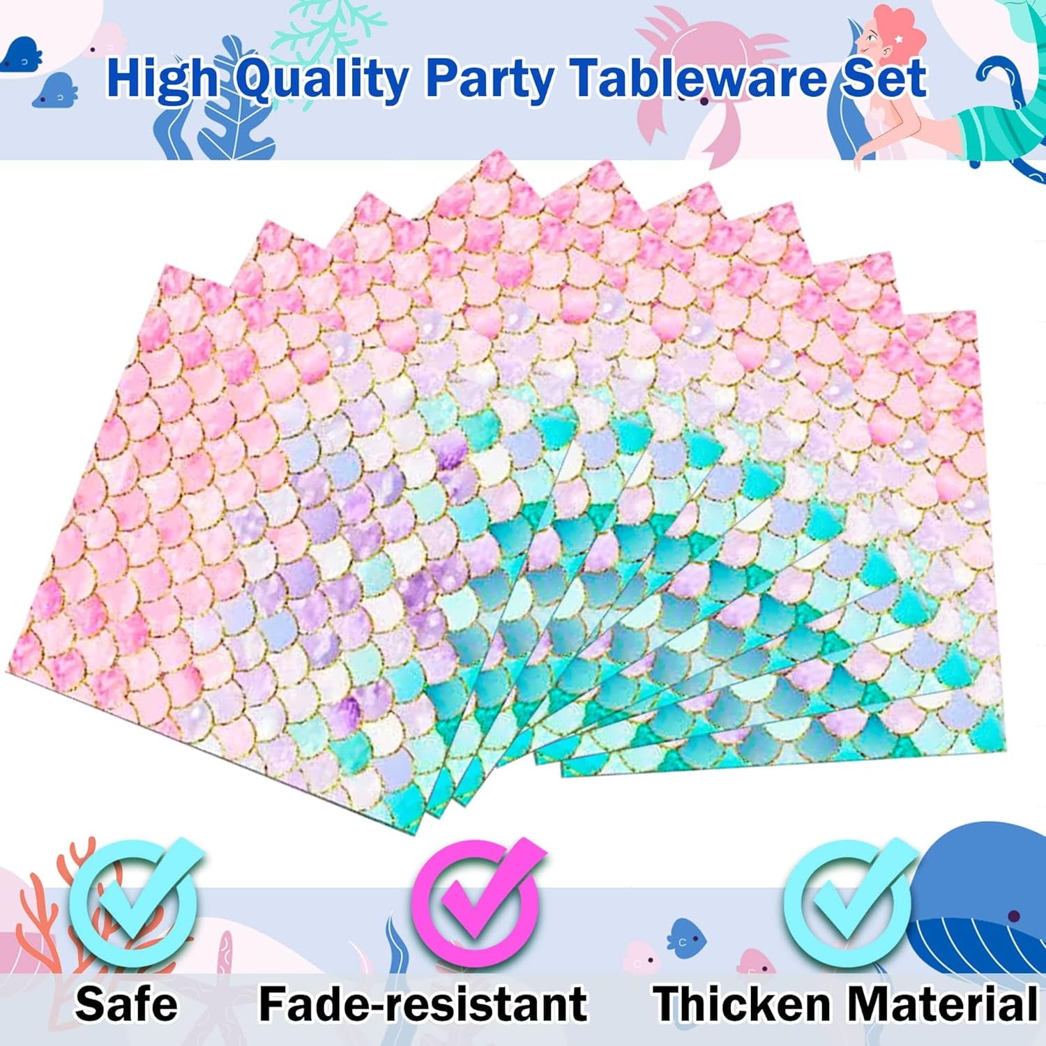 - 【Under the Sea Mermaid Theme Design】: This mermaid birthday party supplies decorations tableware is mainly designed with fish scales. The unique design of fish scale on mermaid plates and napkins party supplies makes mermaid characteristics more obvious. This design fits the ocean theme party very well and it’s very popular with children.