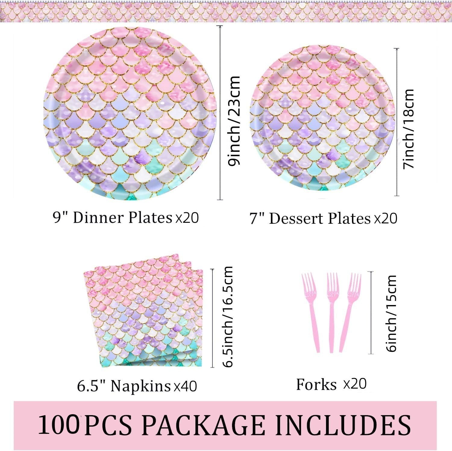 【Mermaid Party Supplies Serves 20】: This birthday party supplies set including 20 plates 9inch, 20 plates 7inch, 40 napkins 6.5inch and 20 Forks, Serves 20 guests, the sufficient quantity to meet your party use and replacement needs.