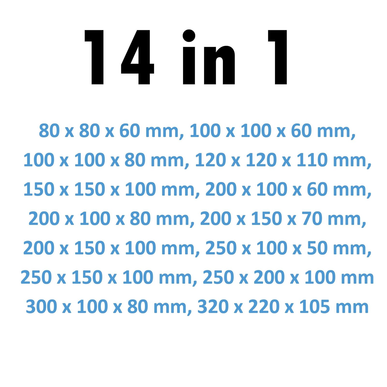 80 x 80 x 60 mm, 100 x 100 x 60 mm, 100 x 100 x 80 mm, 120 x 120 x 110 mm, 150 x 150 x 100 mm, 200 x 100 x 60 mm, 200 x 100 x 80 mm, 200 x 150 x 70 mm, 200 x 150 x 100 mm,