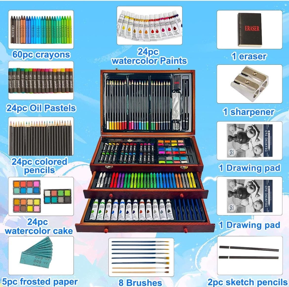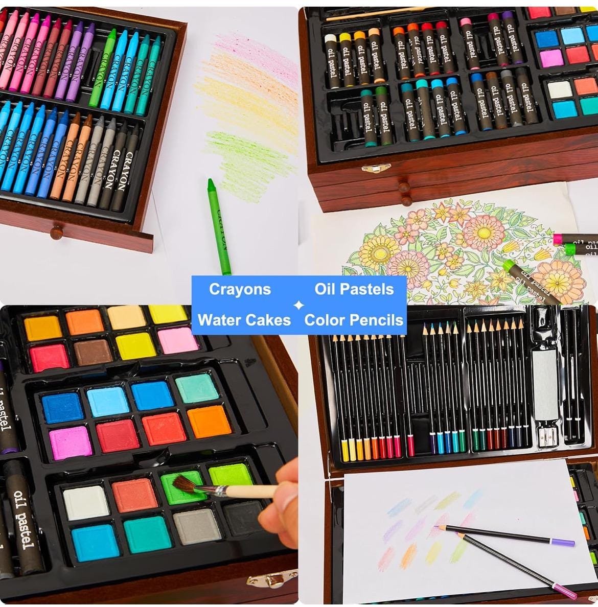 Unleash creativity with our High-Quality 175-Piece Deluxe Art Kit! Packed neatly in a stylish wooden art case, this complete art set has everything you need to start drawing, painting, coloring, sketching, and doodling right away. Perfect for artists of all levels — from beginners to professionals — including adults, teens, kids, girls, and boys. An amazing gift that promises endless hours of artistic fun!