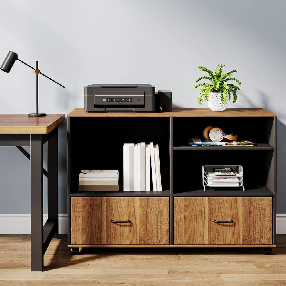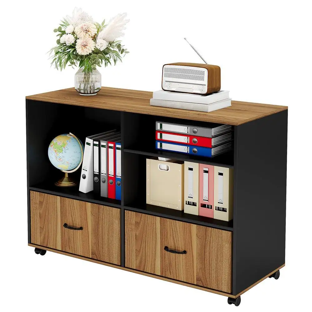 2-Drawer Brown and Black Wood Filing Cabinet, 39.37 in. Lateral File Cabinet on Wheels with Shelves for Files