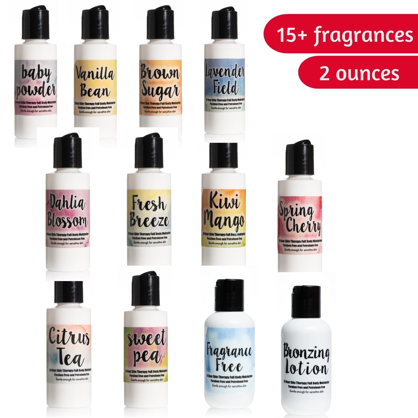 Baby Powder ,Brown Sugar ,Citrus Tea ,Dahlia Blossom ,Fragrance Free ,Fresh Breeze ,Kiwi Mango ,Lavender Fields ,Lively Lemon ,Spring Cherry ,Sugar Cookie ,Pistachio Delight ,Perfectly Peppermint ,Pumpkin Roll ,Vanilla Bean ,Bronzing |
