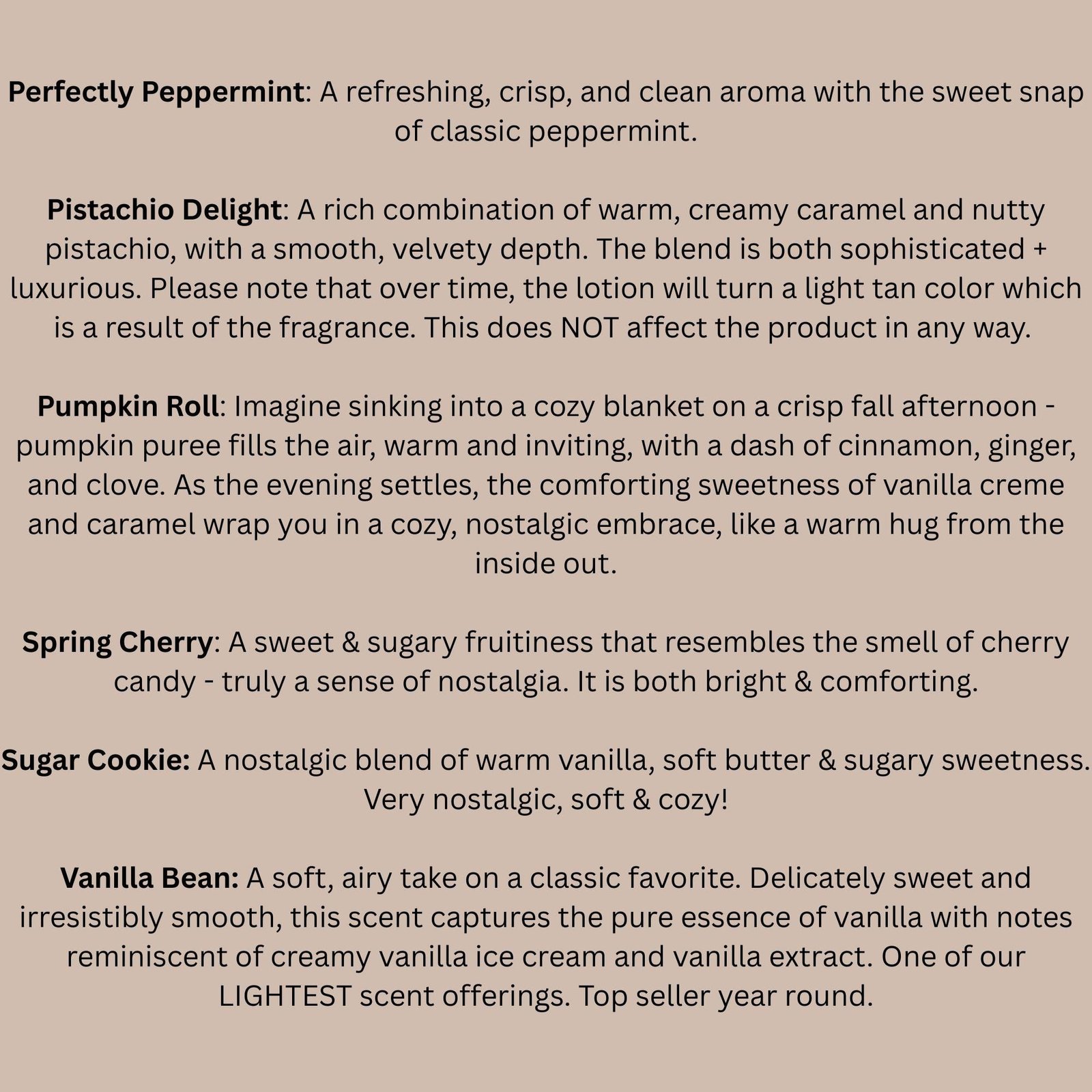 Pistachio Delight: A rich combination of warm, creamy caramel and nutty pistachio, with a smooth, velvety depth. The blend is both sophisticated + luxurious. Please note that over time, the lotion will turn a light tan color which is a result of the fragrance. This does NOT affect the product in any way.