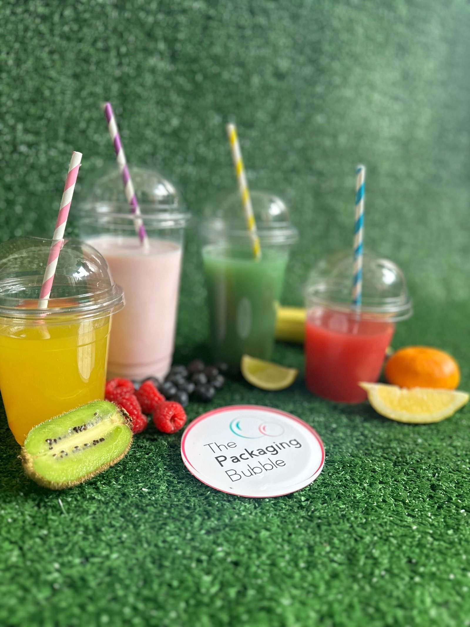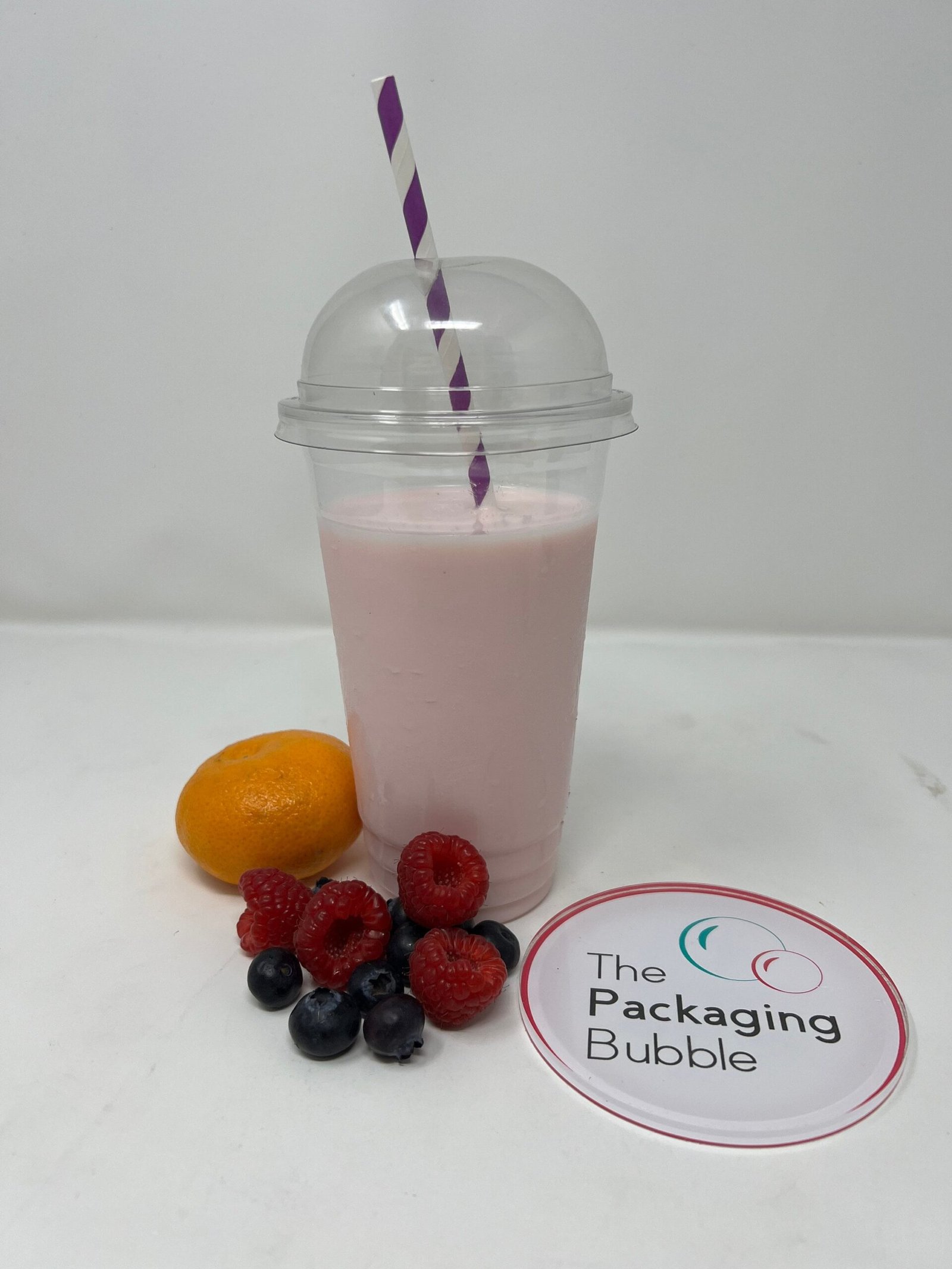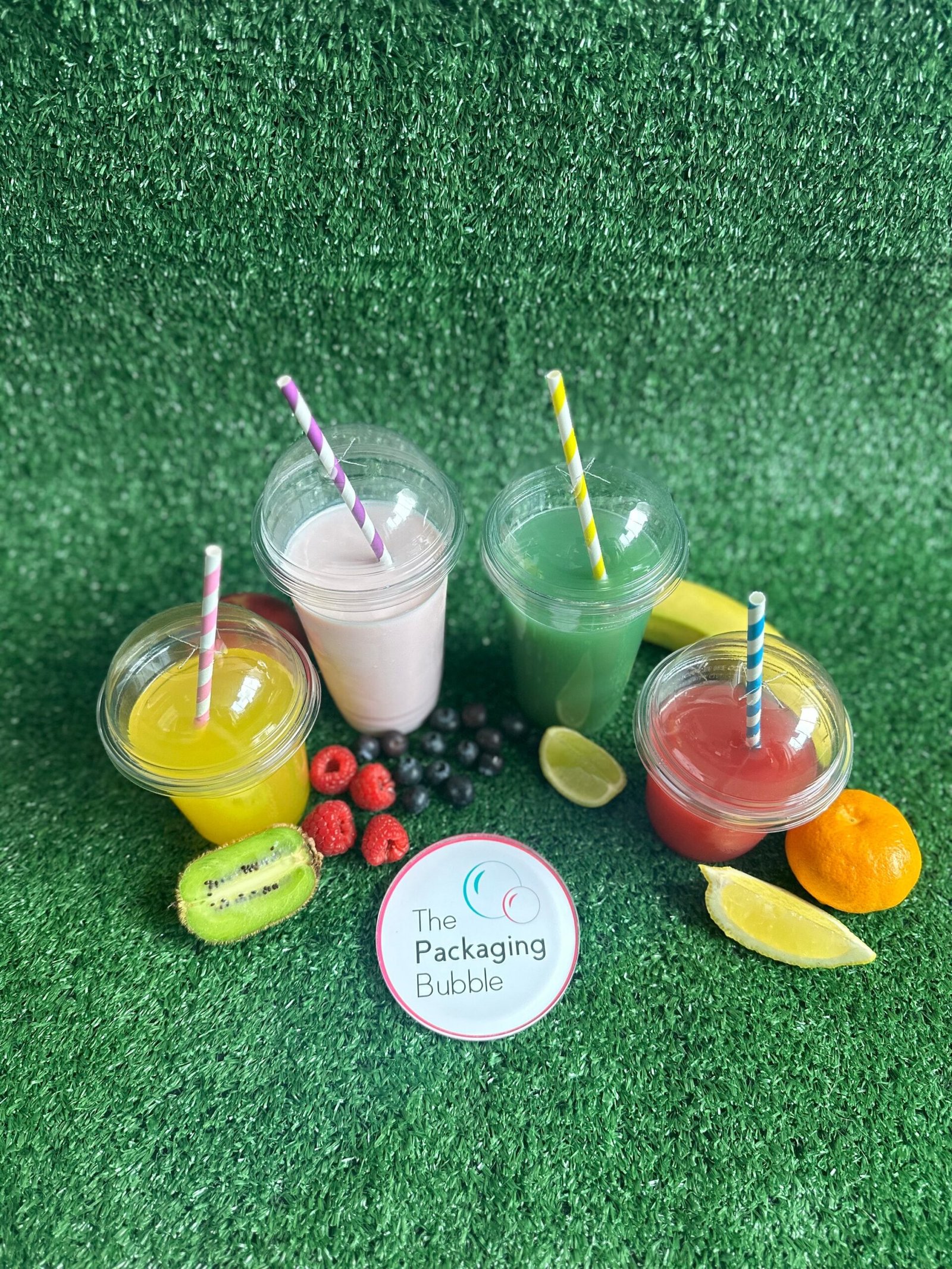 Top quality professional multipurpose smoothie/ milkshake clear cups with or without dome lids with pre perforated straw hole. EU certified for food use.