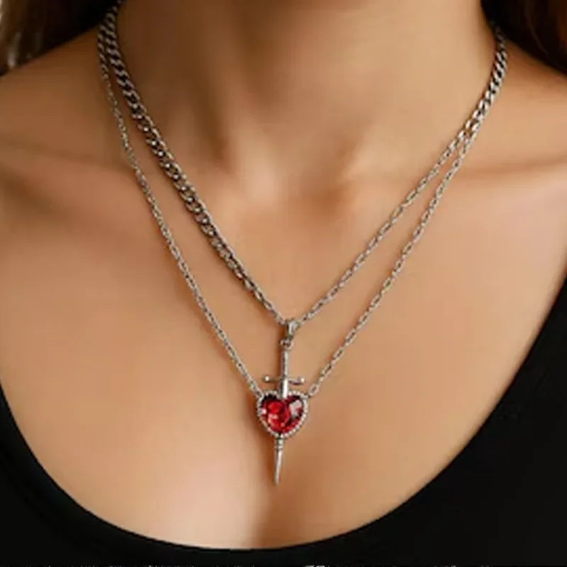 Be the first to review “2pcs 2025 New Heart and Sword Red Zircon Pendant Necklace for Women Men Couple Silver Plated Choker Chain Jewelry Gifts” Cancel reply