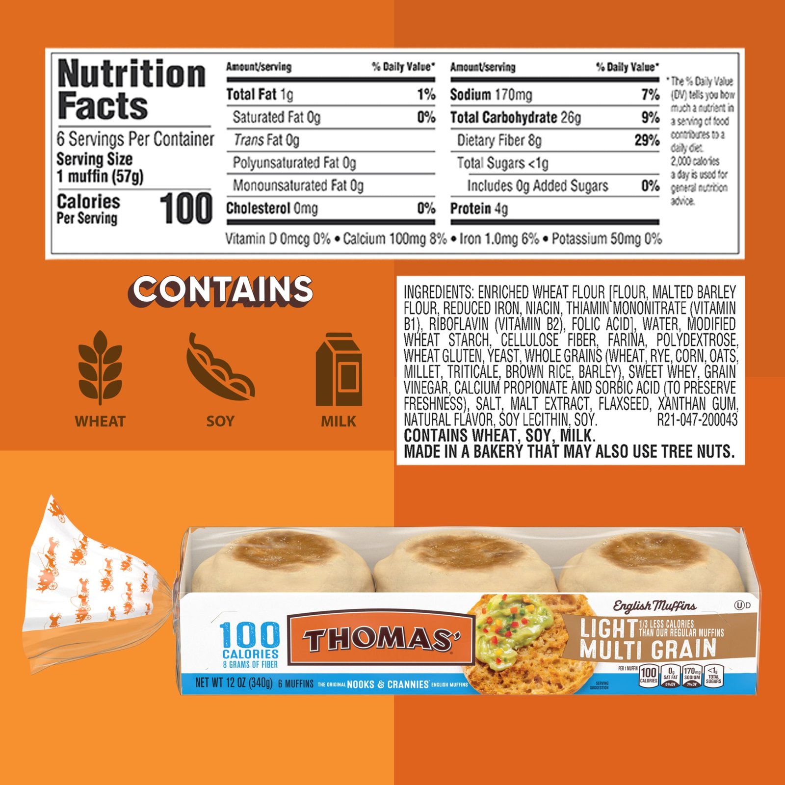 Breakfast tastes better with multi-grain goodness, thanks to Thomas’ Light Multi Grain English Muffins. These English Muffins feature the trademark Nooks and Crannies texture you love with a great taste for an irresistible quick breakfast. Thomas’ English Muffins are always made with no high fructose corn syrup and are a cholesterol free food. Each multi grain English Muffin contains 8 grams of fiber per serving and 1/3 fewer calories than regular English Muffins. Toast and top this Thomas Light English Muffin with your favorite jam or preserves for an easy breakfast. Add yogurt and fresh fruit to these Light English Muffins for a personal fruit pizza. Put fruit and cream cheese in the nooks and crannies for a tasty English Muffin sandwich. Any way you enjoy these fork split English Muffins, the texture and flavor make for a delicious bite you and your family will love. Start your day the right way with Light Multi Grain English Muffins from the breakfast food brand with more than 140 years of experience, beginning with the original Nooks and Crannies English Muffins. Thomas’ delivers delicious tastes for a breakfast like no other. This item is Shelf Stable. Size Description: Regular. Product Type: English Muffins