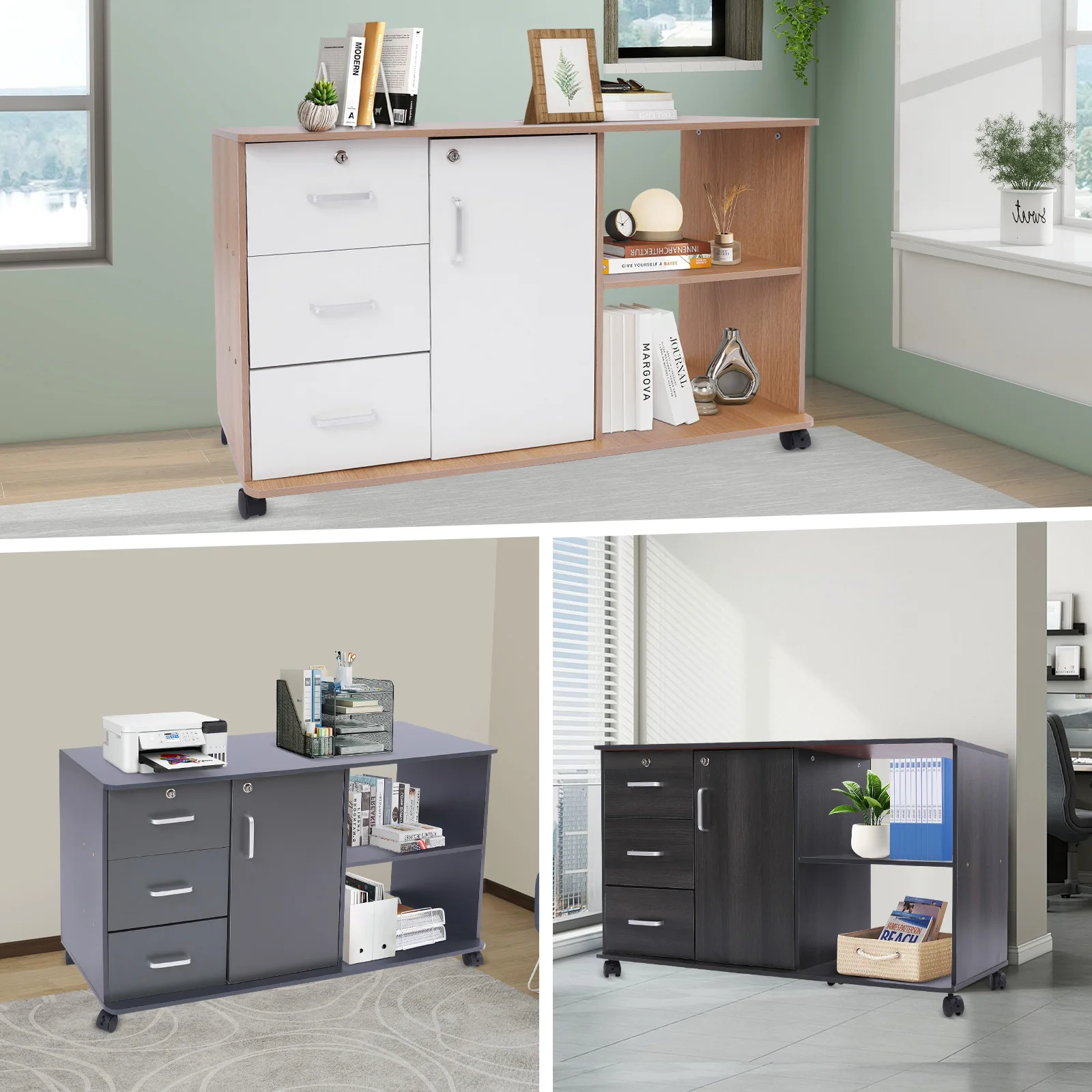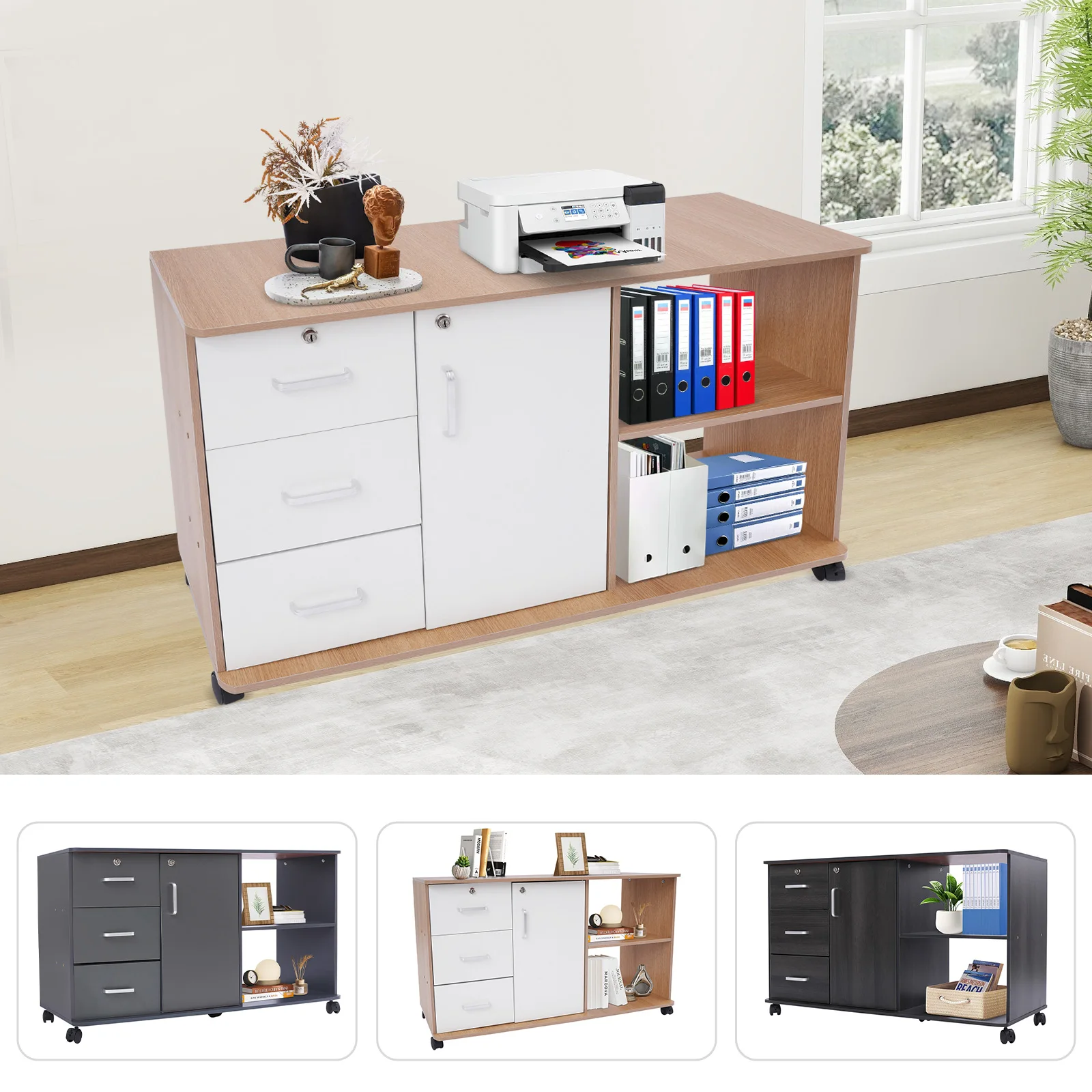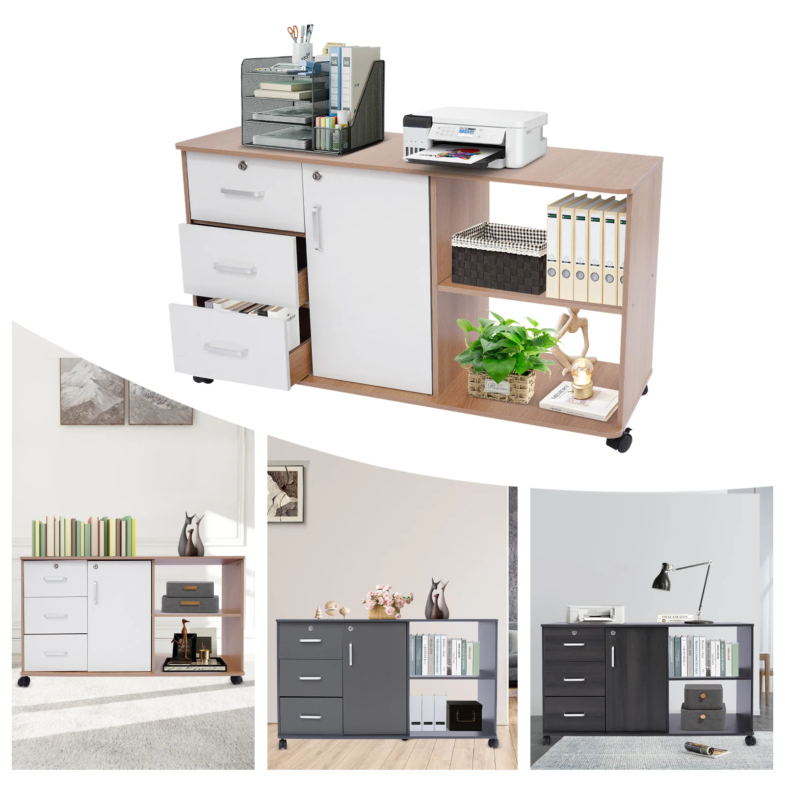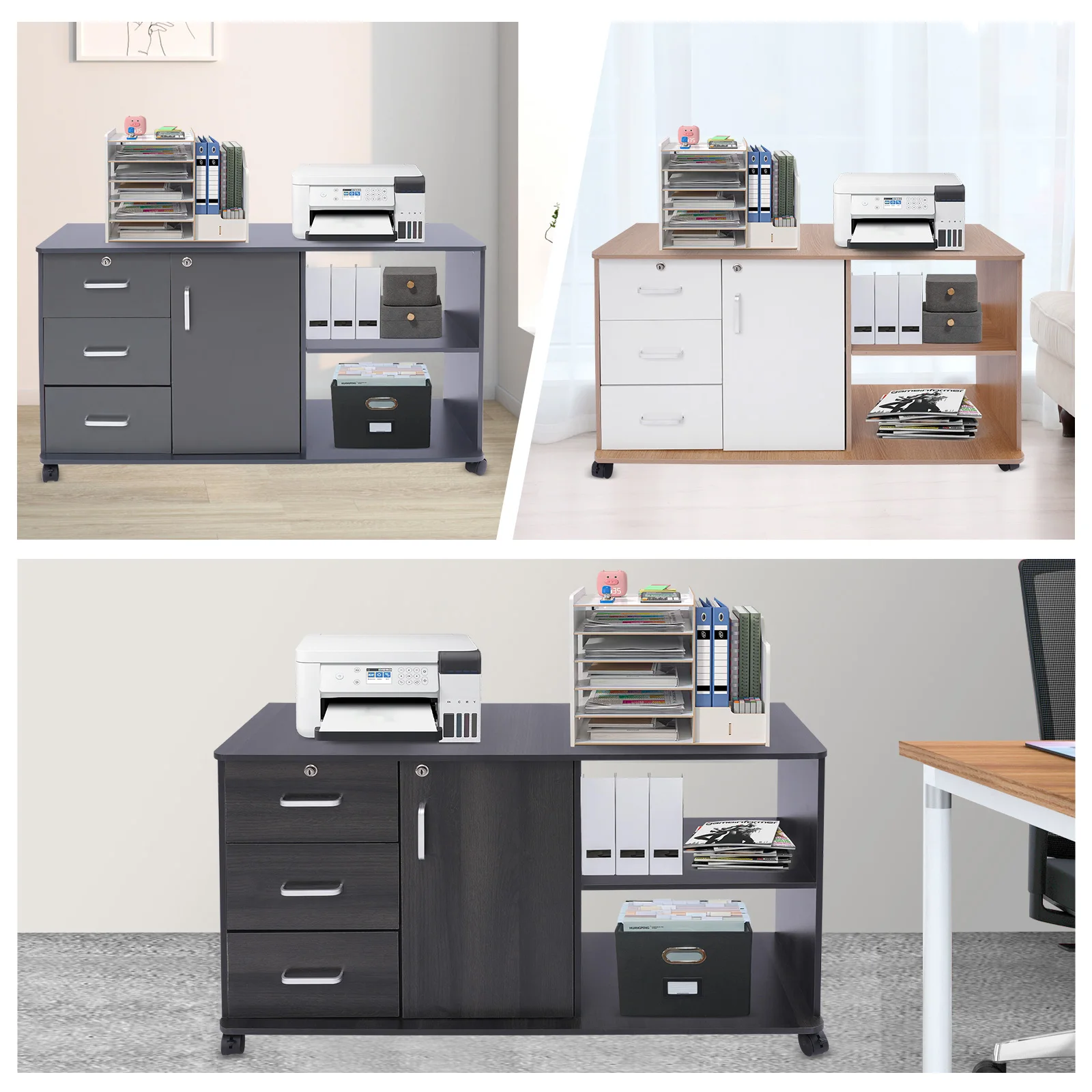 Be the first to review “3 Drawers 1 Cabinet 2 Compartments MDF File Cabinet,Black/Wood Color/Gray Rectangular File Cabinets for Home Office” Cancel reply