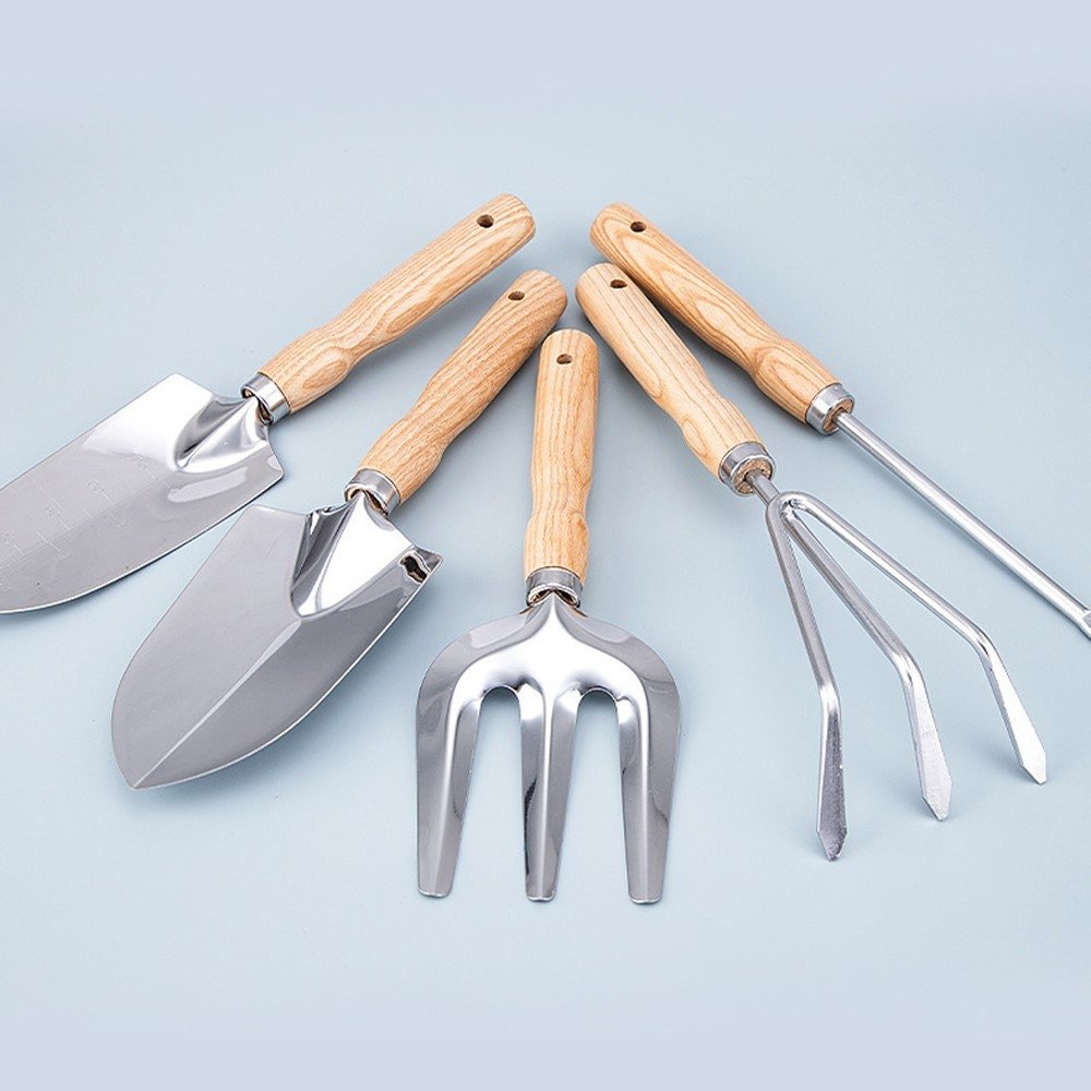 5Pcs Stainless Steel Gardening Tool Wooden Handle Fork Shovel Rake Set