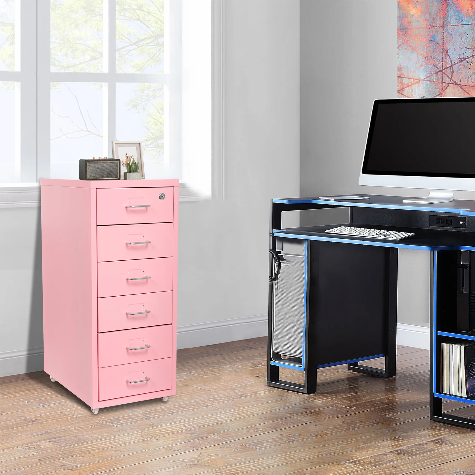 6 Tiers Cold-rolled Steel Filing Cabinet,Pink Metal File Cabinet with Lock 28*41*69cm Wipe with Soft Cloth for Office,Study