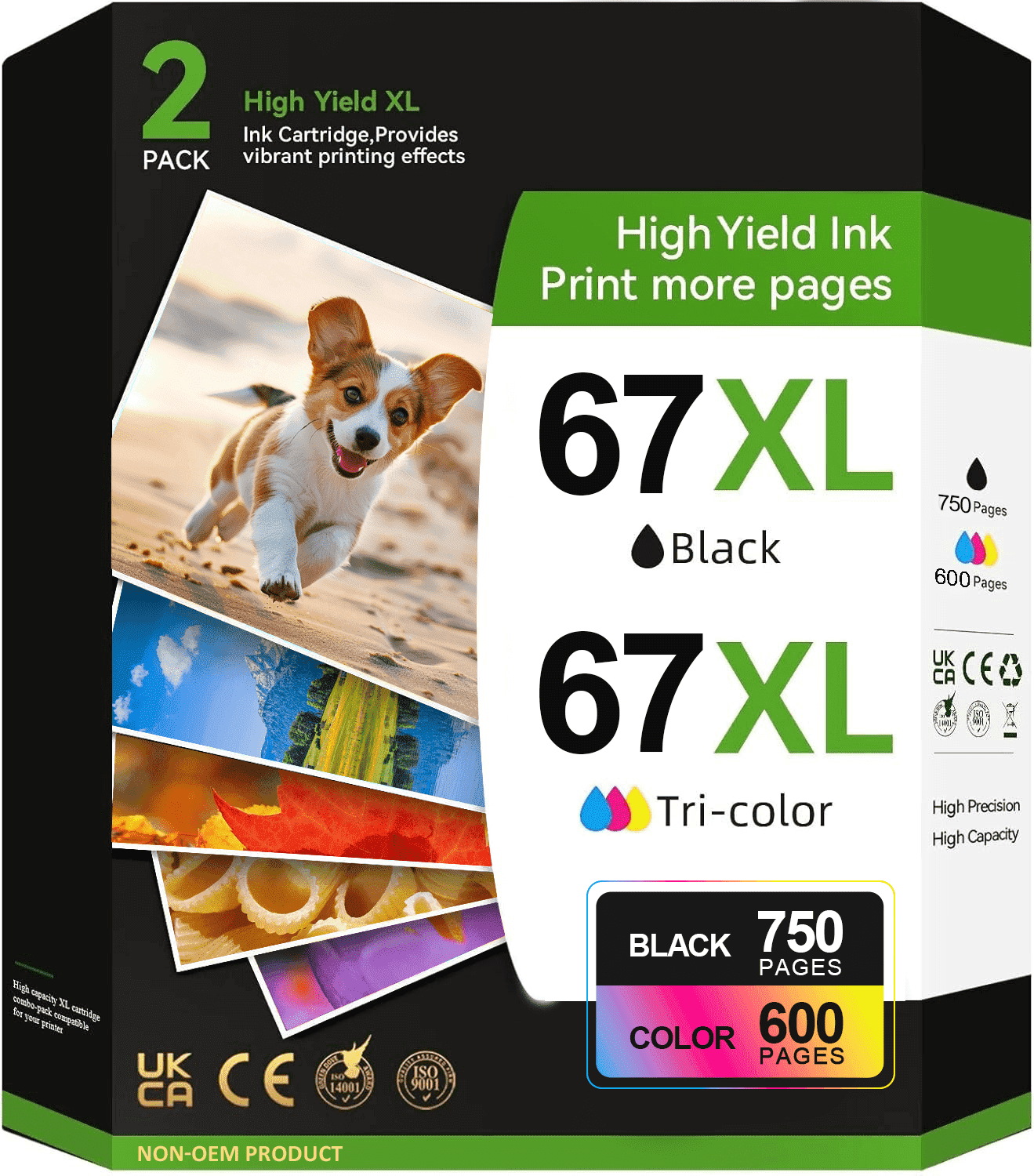 Package Contents: Includes 1 Black 67XL Ink Cartridge and 1 Tri-Color 67XL Ink Cartridge.