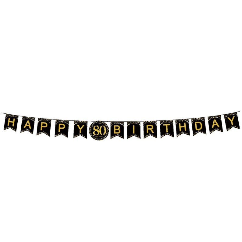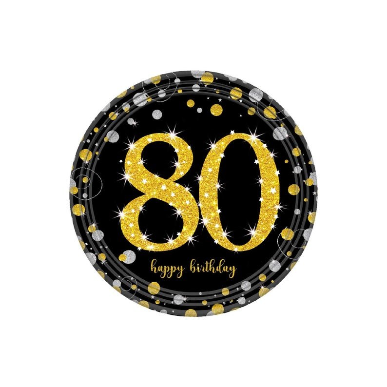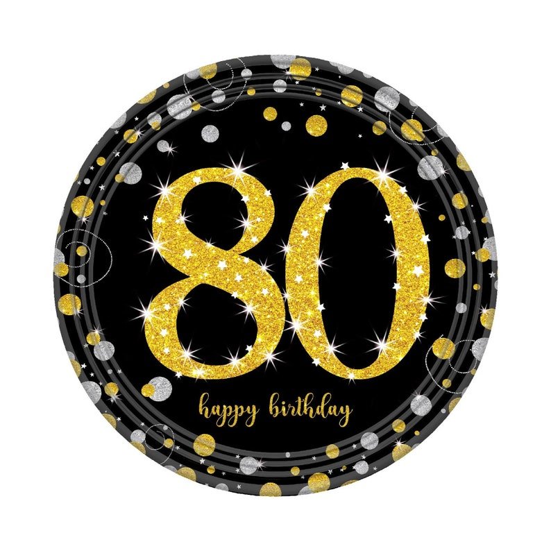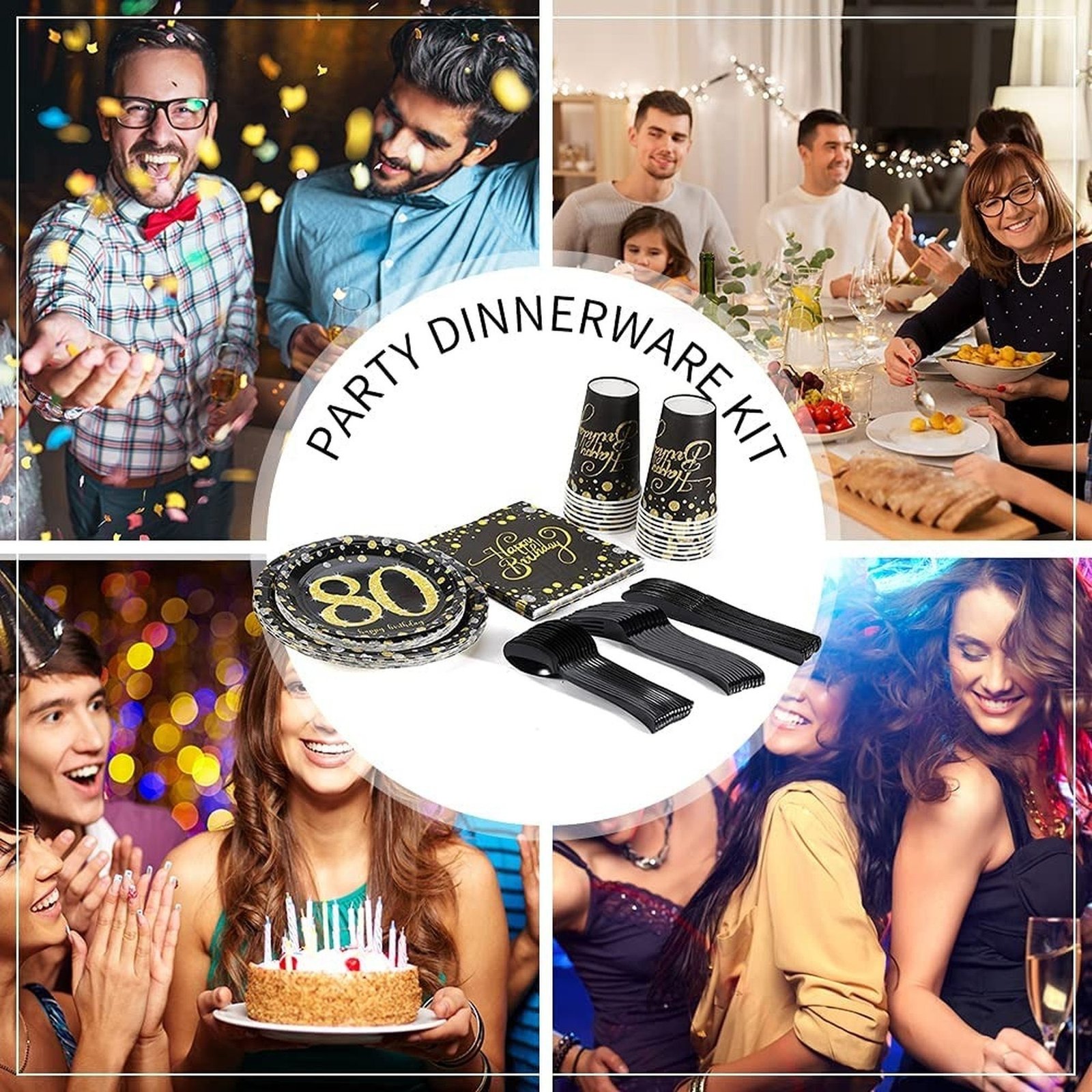 ELEGANT BLACK AND GOLD DESIGN. Make your birthday celebration fun and fabulous with this beautiful party supplies set. Dinnerware features a large gold 80th writing in the center with a black background and accents of gold dot. Amazingly attractive!