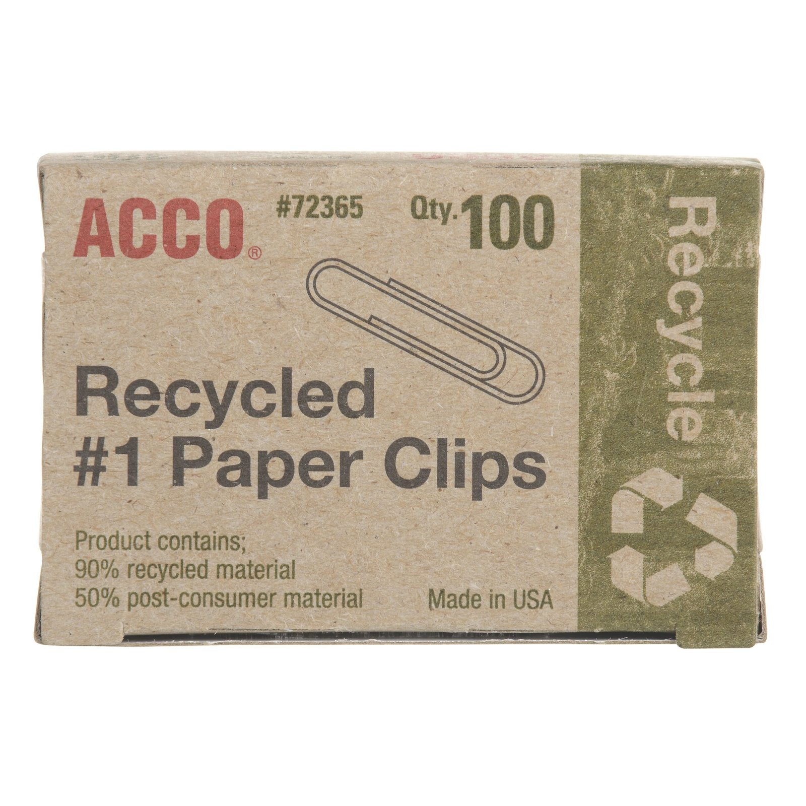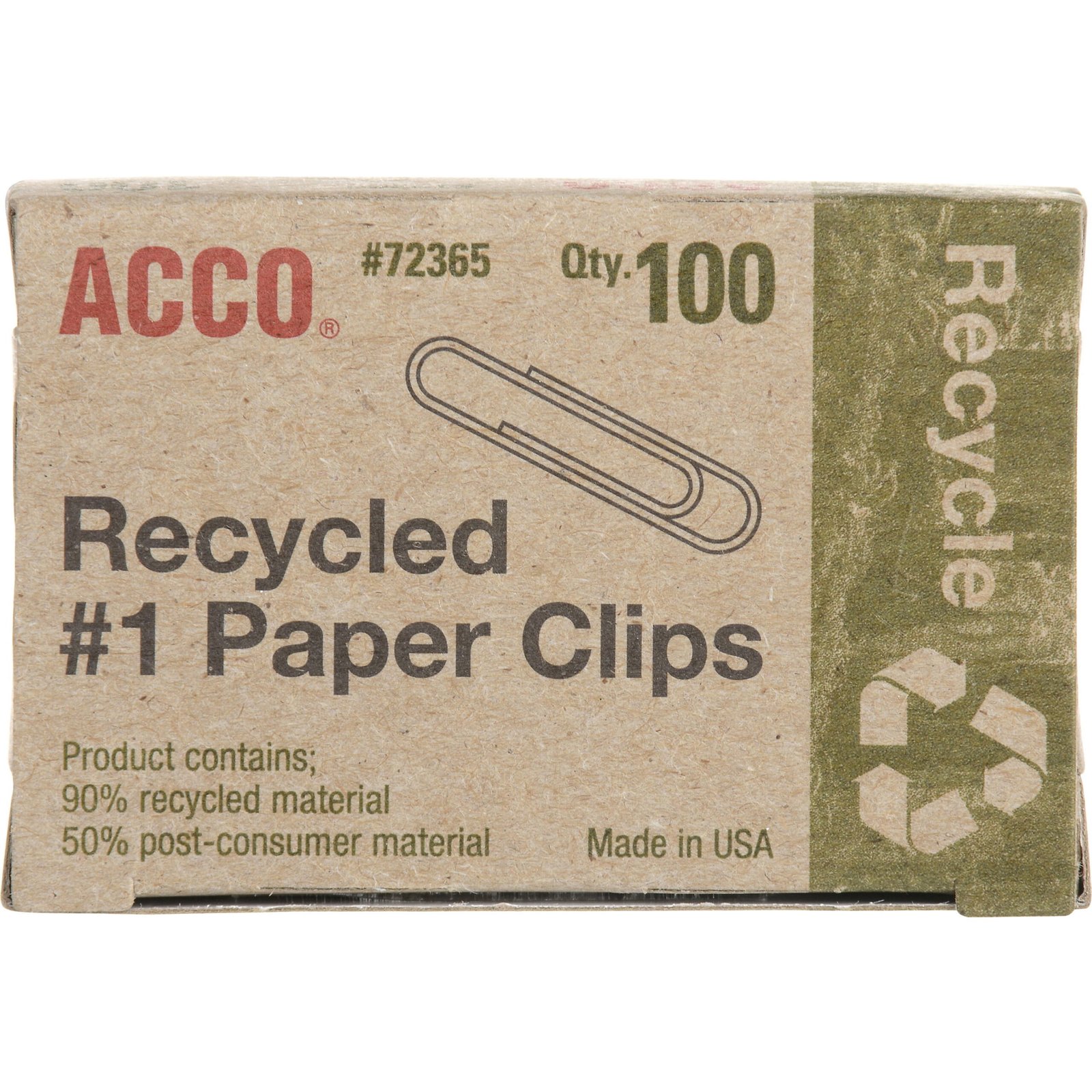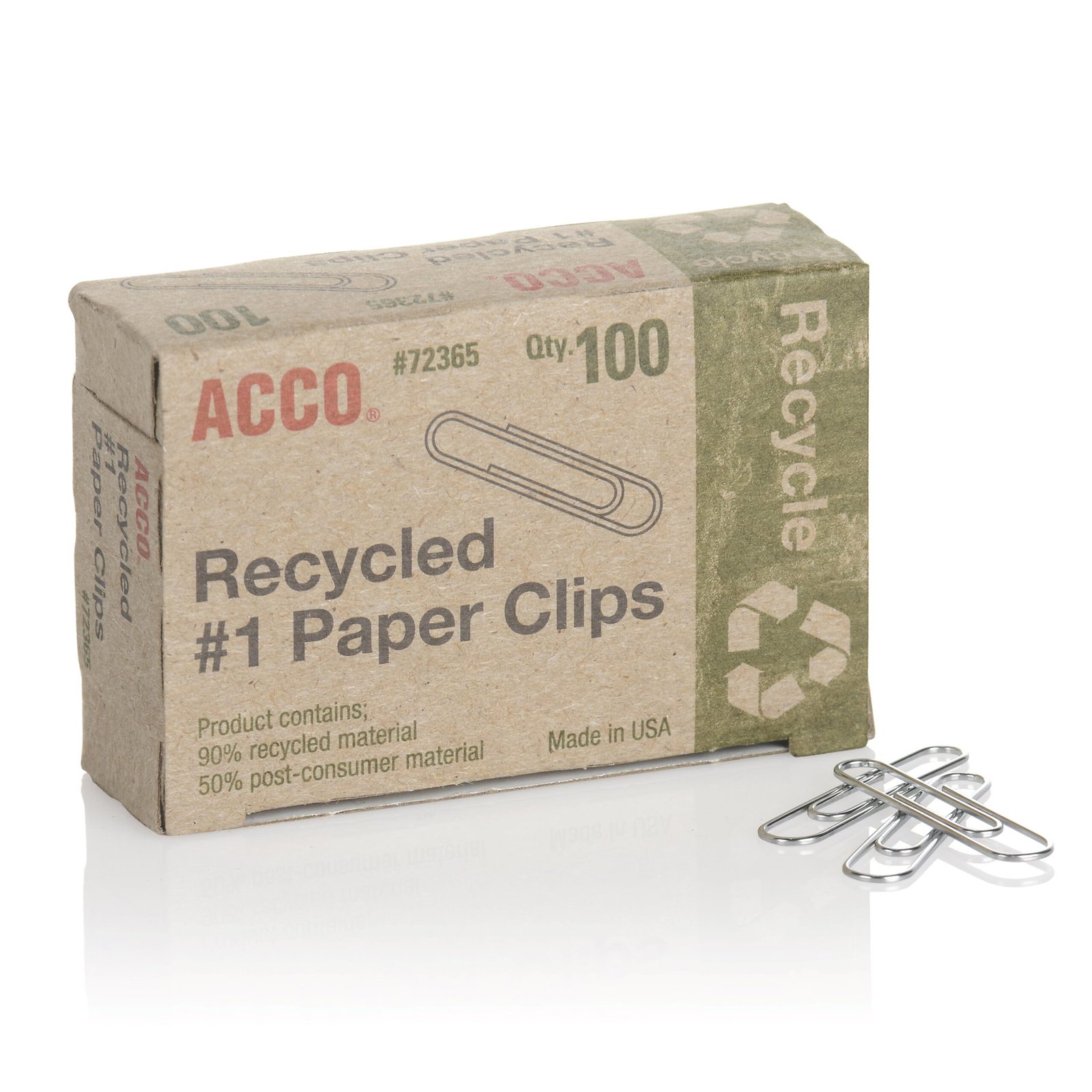 ACCO Recycled Paper Clips, Smooth Finish, #1 Size, 100/Box, Silver 72365
