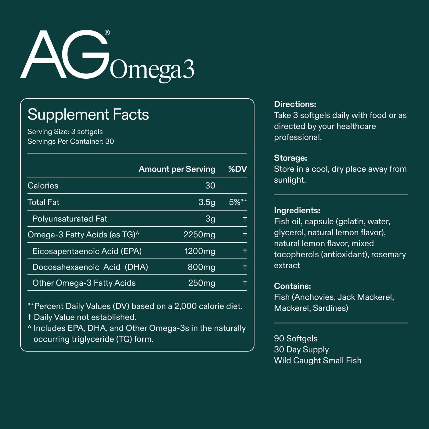 AG OMEGA3: Complements AG1 by providing additional support for brain and heart health. Each capsule delivers a high concentration of EPA and DHA from wild-caught small fish, making it easy to get the additional fatty acids you need daily.*
