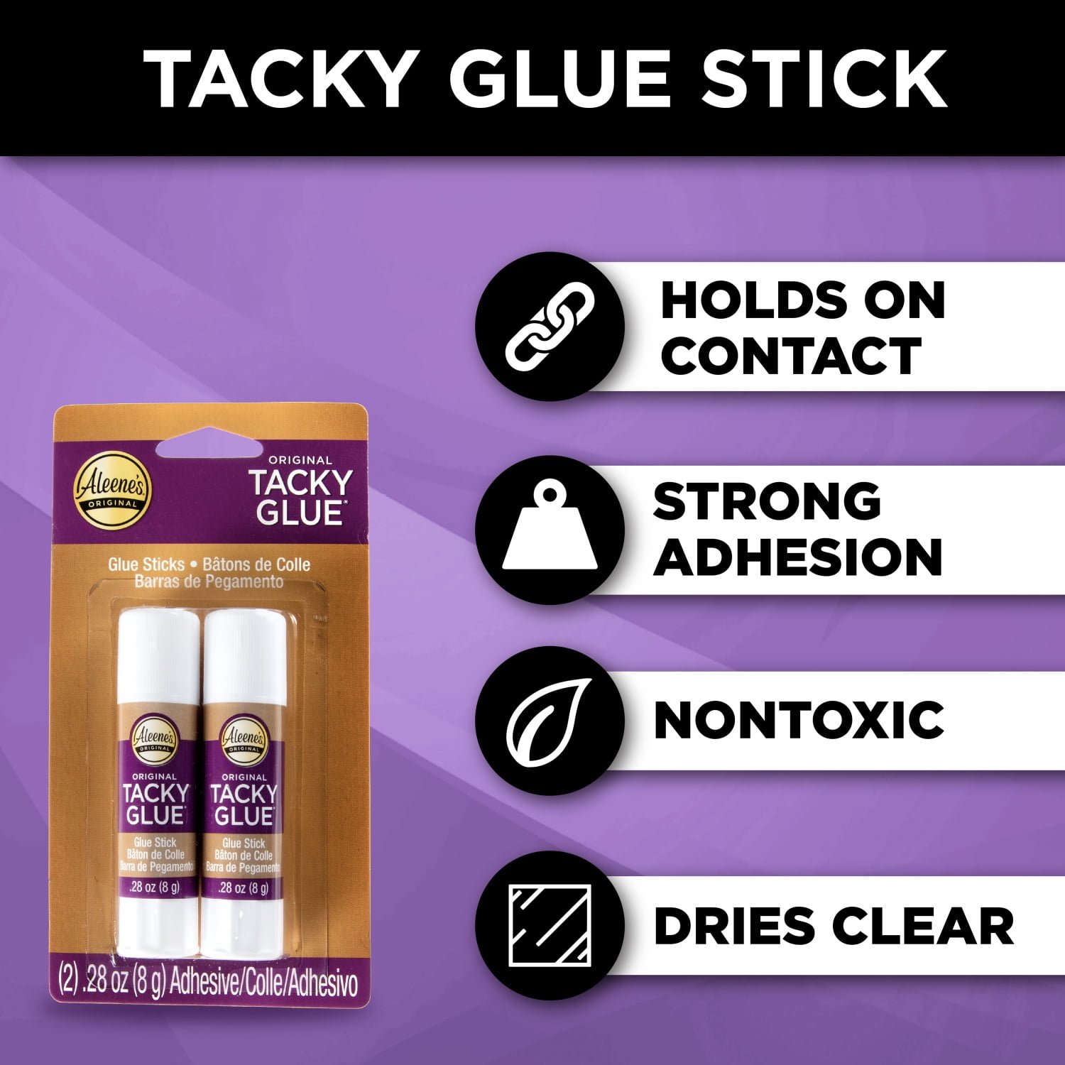 Founded in Los Angeles, California, Aleene’s has been the glue of choice for crafters for over 75 years! From that first bottle of Aleene’s Original Tacky Glue to today’s variety of 60+ unique adhesive options, every Aleene’s product is formulated to deliver premium quality and performance— that’s why we’re voted America’s Favorite Crafting Glue! Aleene’s Original Tacky Glue Sticks offer the same great qualities of their white Tacky Glue counterpart, but in an easy glide-on formula! One of the most trusted all-purpose adhesives you can find, Aleene’s Original Tacky Glue Sticks works on just about every surface. Its no-mess formula dries super strong, permanent, and clear, making it great for crafts, hobbies, DIYs and household repairs. Features 2 .28 oz Tacky Glue Sticks.