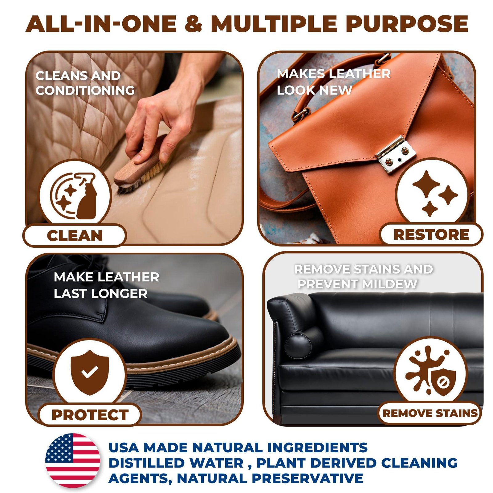 At European Leather Care, we believe in providing safe, natural, and effective solutions for your leather care needs. Unlike other cleaners that rely on harmful chemicals and synthetic ingredients, our all-natural formula is crafted with premium, plant-derived ingredients that safely remove stains while nourishing and protecting your leather.