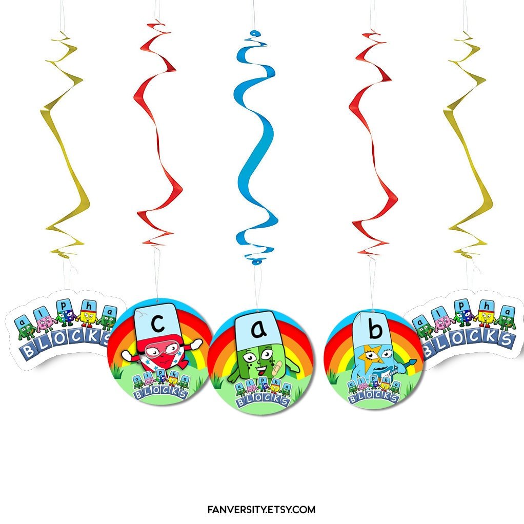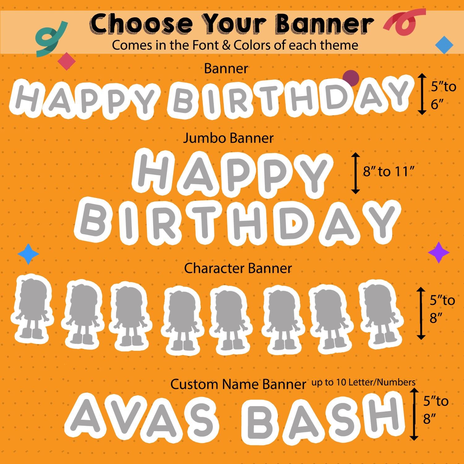 Happy Birthday ,Jumbo Banner ,Custom Name Banner ,Swirl Decor 5pcs ,Custom Cake Topper ,Cupcake Topper 12pcs ,Bags – Set of 5 ,PartyCups – Set of 8 ,Napkin – Set of 8 ,Coloring -Set of 4 ,Click It Blocks |