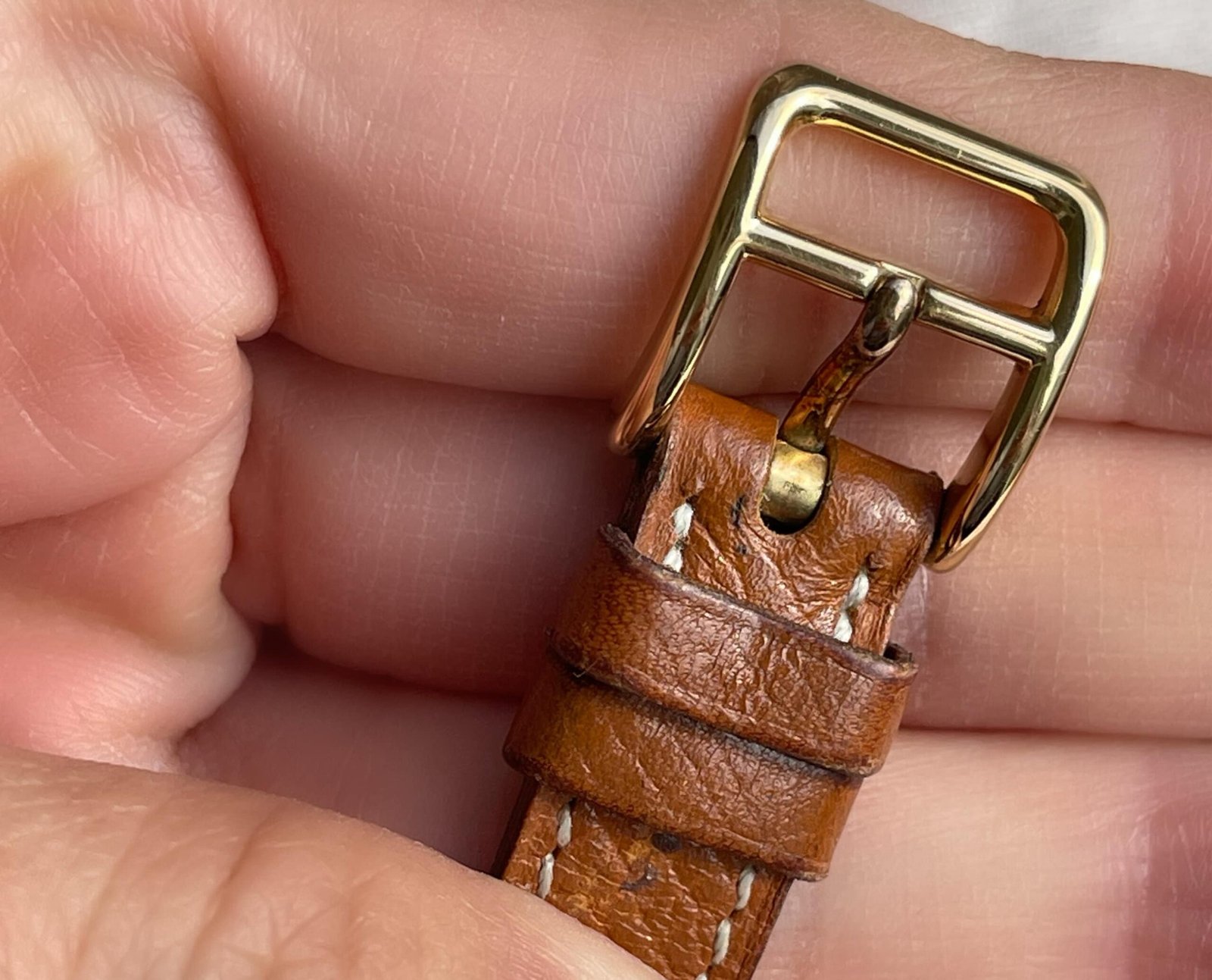 The watch is Swiss made with a Quartz movement, and is in working order. The dial face is champagne colored, beautifully matching the gold-plated hardware. The watch case and bezel is gold-plated, and there is a push-down crown, for you to adjust the time to wherever you are! The brown leather strap has a pin-buckle clasp. There is minimal wear seen on the watch, and the leather strap does not have any shape loss, only general wear as this is a pre-loved item.