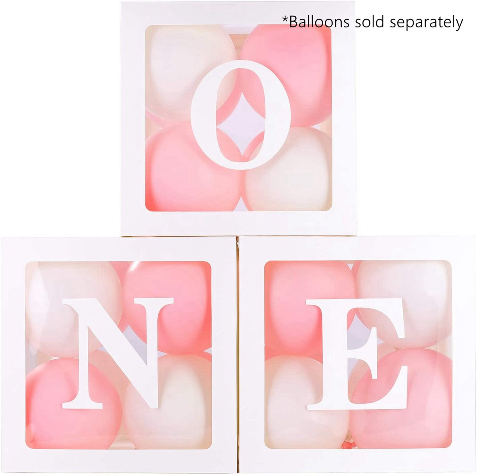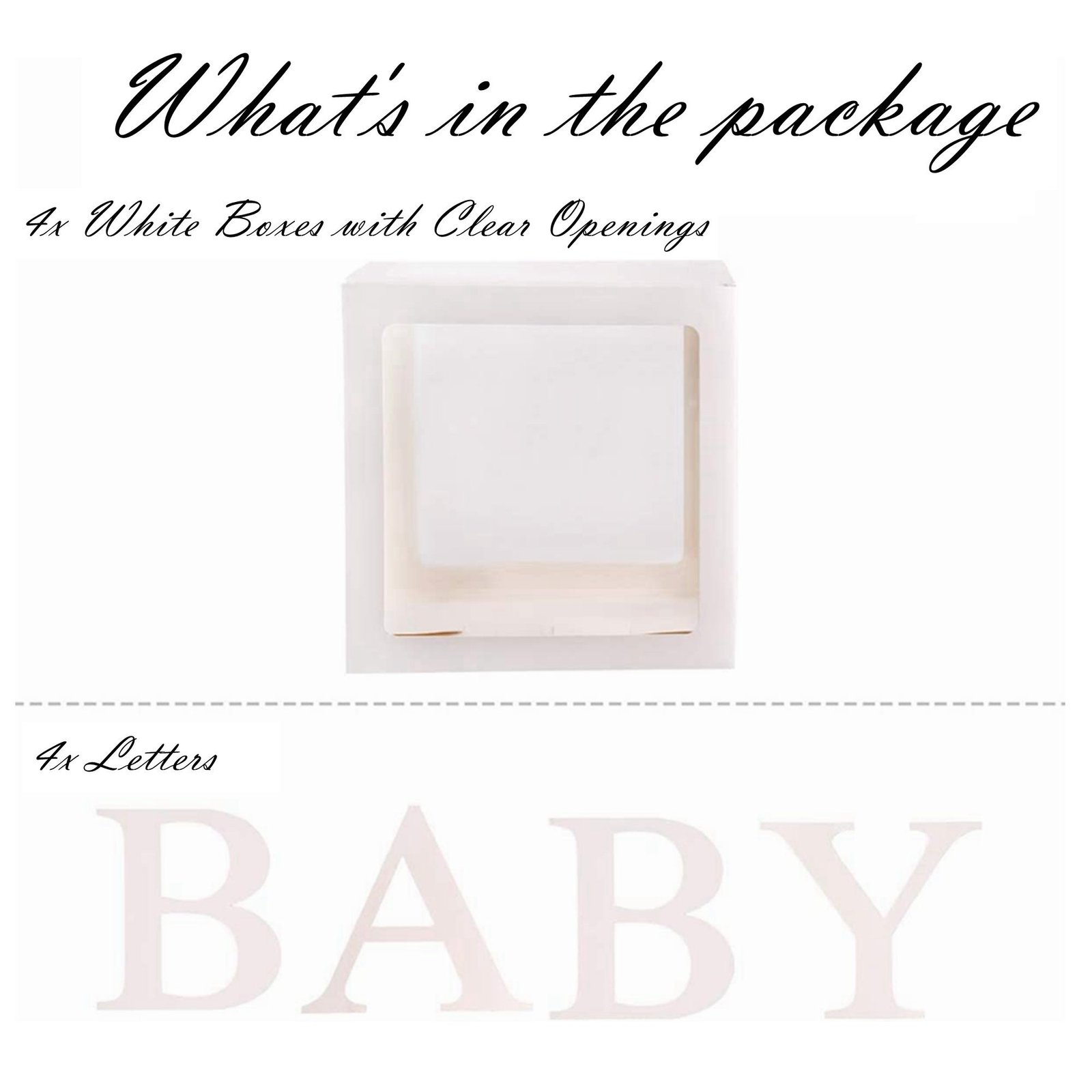 4pc White Boxes ,4pc Rose Gold Boxes ,4pc Silver Boxes ,4pc String Lights ,40pcs Latex Balloons ,3pc White ONE Boxes |