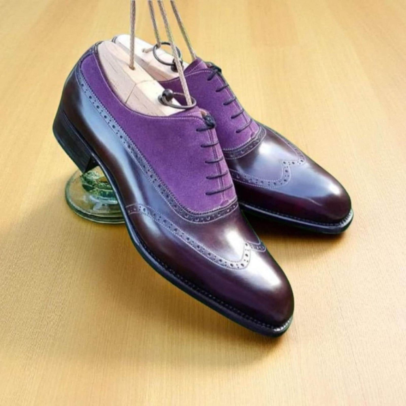 Title: New Classic, Hand Made Men’s Stylish Two-Tone Brown Leather & Purple Suede Lace Up Men’s Formal Oxford Brogue Party Wear Dress Shoes