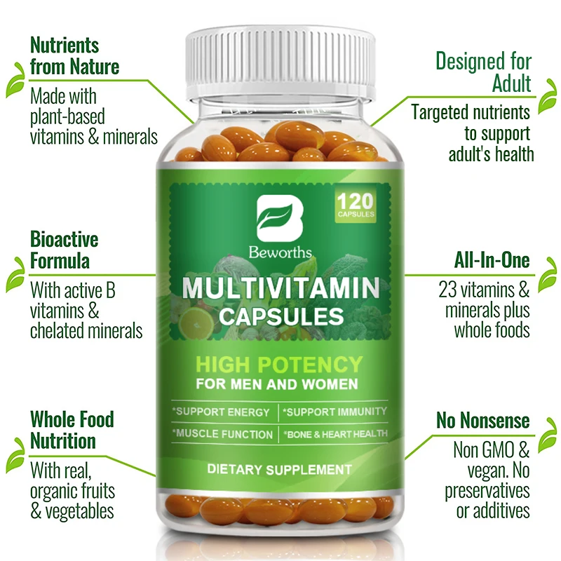 BEWORTHS Multivitamin Capsules with Vitamins & Minerals for Energy Brain Heart Skin Eye Health Immune Support for Women and Men