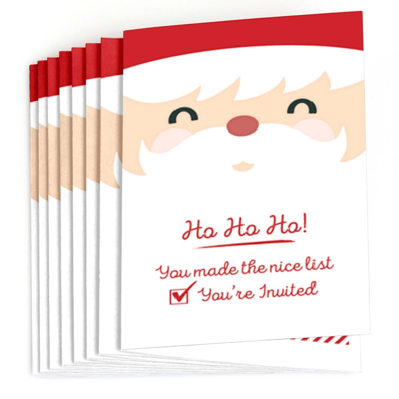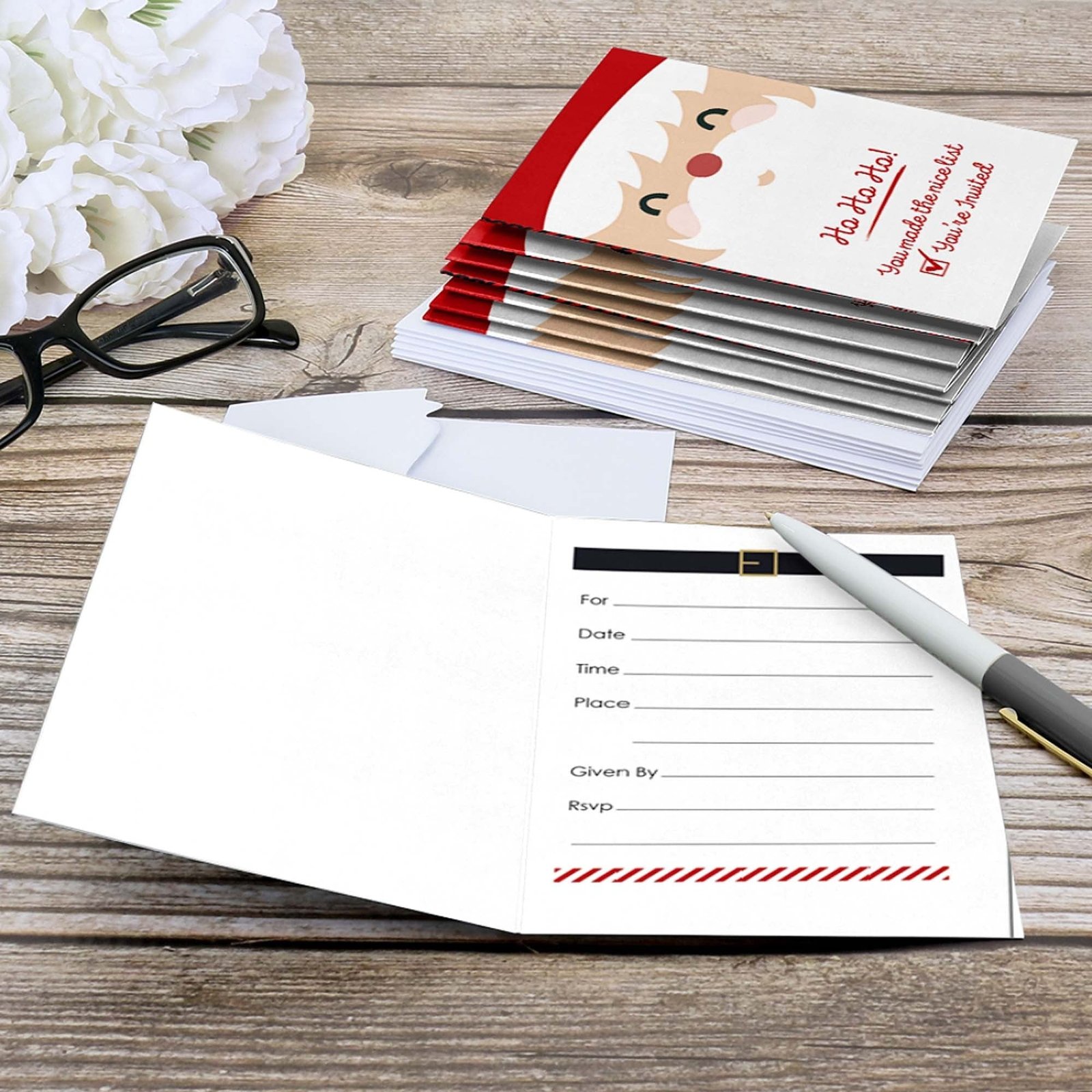- Premium Party Invitations: Jolly Santa Claus – Christmas party invitations are professionally printed on heavy-duty card stock paper with a photo-like shine. They are then hand-folded and individually inspected, then carefully packaged with our exclusive squiggle flap envelopes, making this Santa themed stationary set a must-have for a Holiday party.