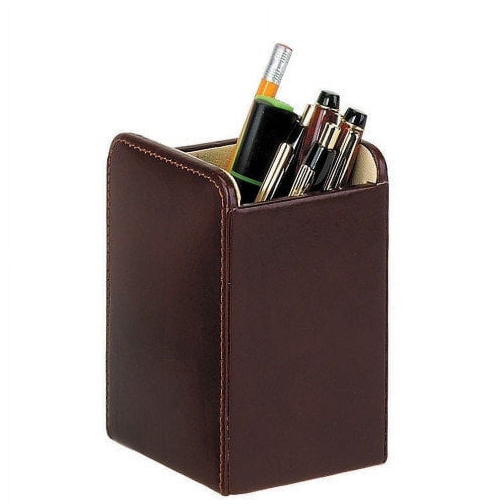 The Desktop Pen Holder is made of full grain cowhide leather, and comes in either black or burgundy. This pen holder is lined with luxe leatherette to give it a striking style. Store your favorite pens and more with a classic style.BLACK DESKTOP PEN HOLDER