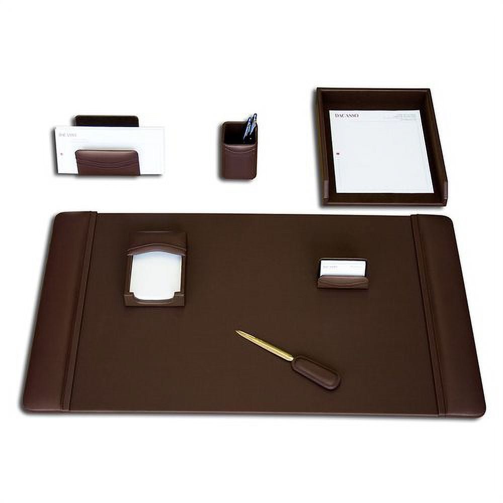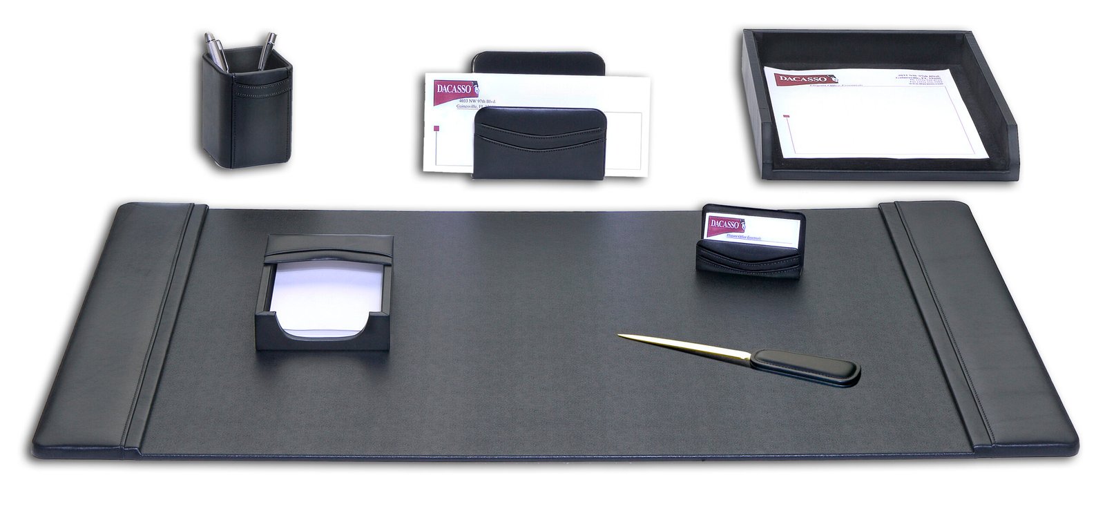 The perfect way to accessorize, protect, and organize your office in style. This complete desk accessory set contains everything you need to outfit your desk. All pieces are made in a luxurious top-grain leather with felt backing. The felt bottoms make all of the accessories safe for your desktop surface, no risk of scratching. This set includes: 34-inch by 20-inch desk pad with side rails, front-load letter tray, pencil cup, 4-inch by 6-inch memo holder, letter holder, business card holder, and letter opener. Make your desk the envy of the office with this beautiful matched set.Black Leather 7-Piece Desk Set