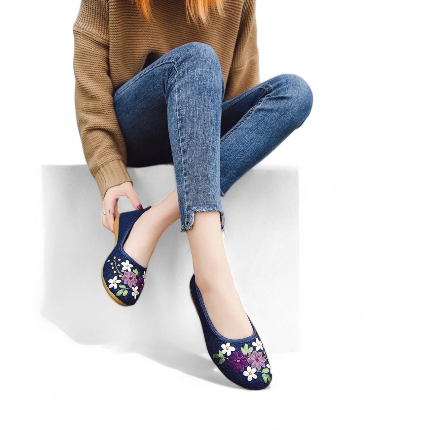 Blue Canvas Ballet Flats with Purple & White Ribbon Flowers | Comfortable Womens Daily Casual Shoes | Cute Womens Summer Shoes
