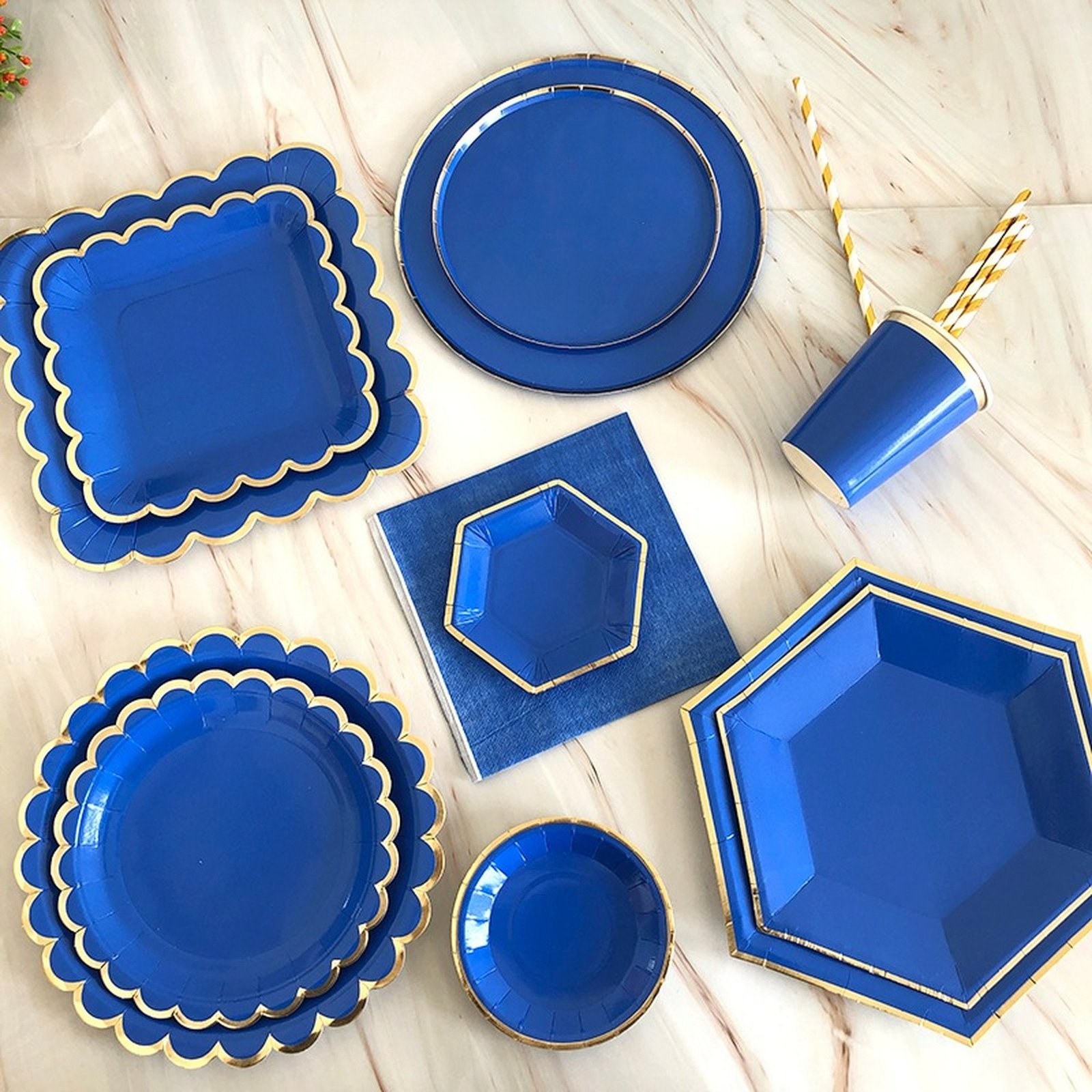 270ml Cups 8PCS ,33X33cm Napkins 16PC ,7in Round Plates 8PC ,9in Round Plates 8PC ,7in Square Plate 8PC ,9in Square Plate 8PC ,7in Wave Plates 8PCS ,9in Wave Plates 8PCS ,8in HexagonPlate 8PC ,10in HexagonPlate8PC ,7in DecagonPlate 8PC ,9in DecagonPlate 8PC ,10PCS Straws |