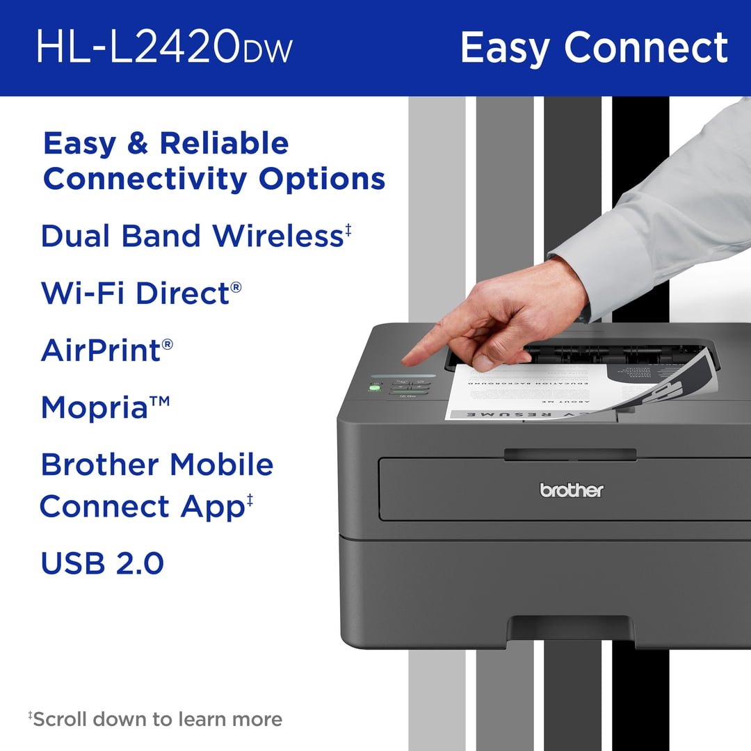 The Brother HL-L2420DW is designed for efficiency, reliability, and quality. This compact wireless laser printer delivers crisp black and white prints at speeds of up to 30 pages per minute*, with automatic two-sided printing to help save time and reduce paper waste. Its space-saving design fits easily into home offices or small workspaces, and the 250-sheet paper tray*2, with a manual feed slot, supports both standard documents and specialty papers, such as envelopes. Setup is easy with flexible dual-band wireless and USB 2.0 connectivity. Printing from virtually anywhere is simple using the Brother Mobile Connect App.*3 Built for quiet operation and dependable performance, it features Toner Save Mode, which helps conserve toner. It supports the Brother Refresh EZ Print Subscription,* 4,*5, which offers convenient toner delivery and savings. The printer is ENERGY STAR compliant, EPEAT Silver-rated, and utilizes Brother Genuine Toner TN830 series and Drum DR830 for consistent results. Backed by a 1-year limited warranty and lifetime online, phone, or live chat support.