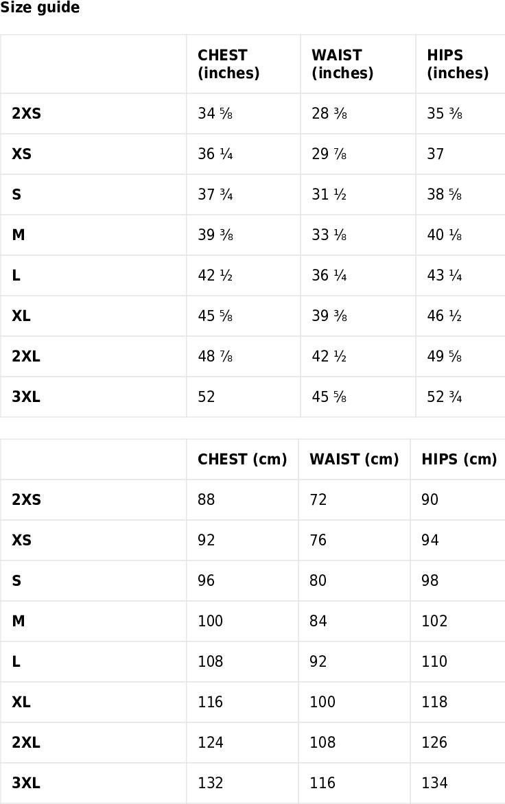 2XS ,XS US letter ,S US letter ,M US letter ,L US letter ,XL US letter ,2X US letter ,3X US letter |
