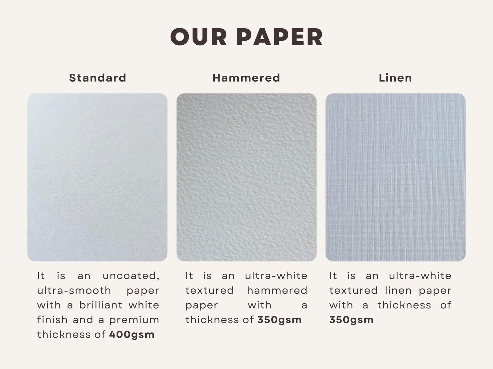 Crafted to stand out, our premium cards are printed on ultra-thick 400gsm cardstock with vibrant, full-colour precision. Choose from three elegant finishes — Standard, Hammered, or Linen — and complete your look with square or rounded corners for that extra touch of sophistication.