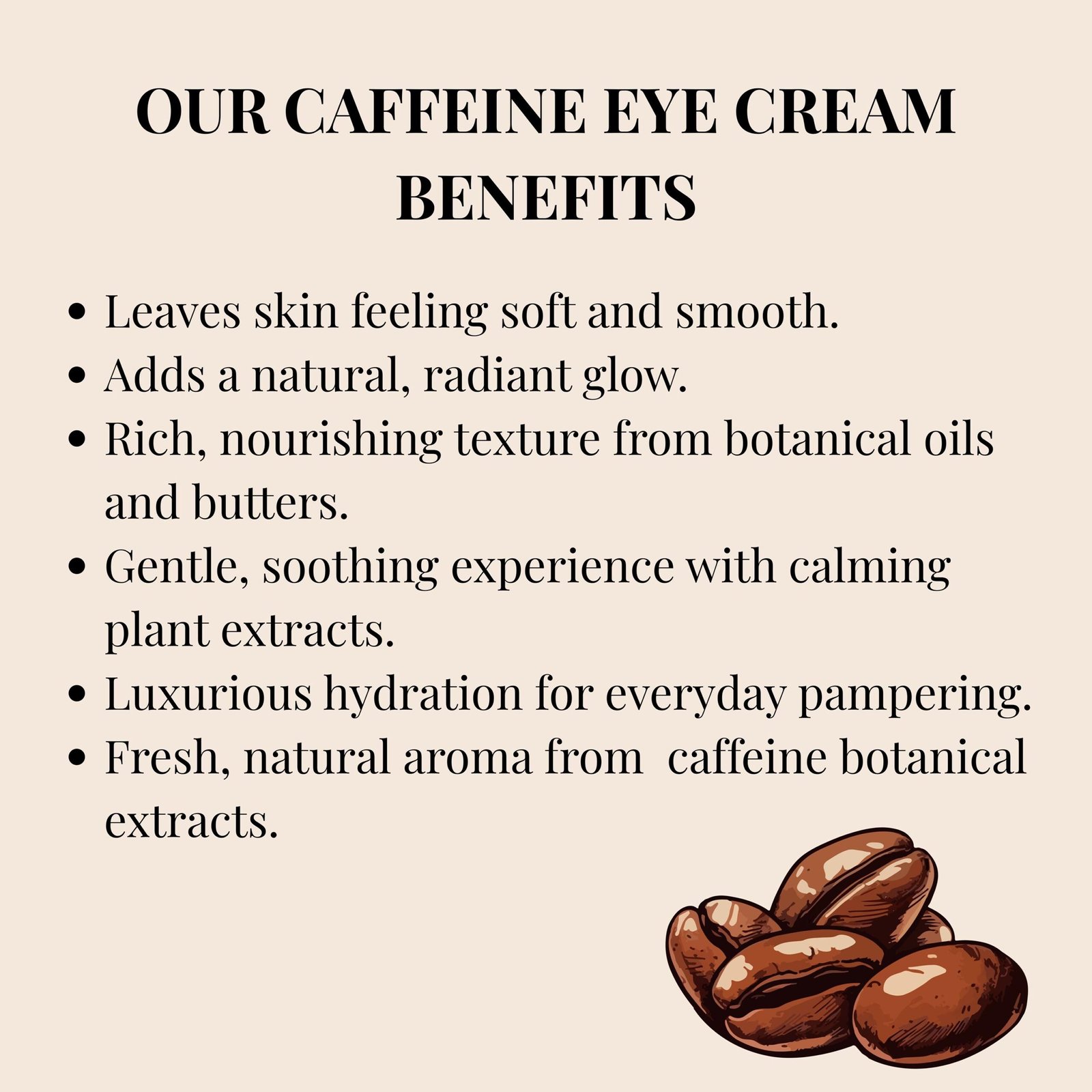 Gently refresh your under-eye area with our Caffeine Eye Cream — a lightweight, botanical moisturizer made for daily self-care. Perfect for morning or evening routines, this natural eye lotion absorbs easily and pairs beautifully with your skincare rituals.