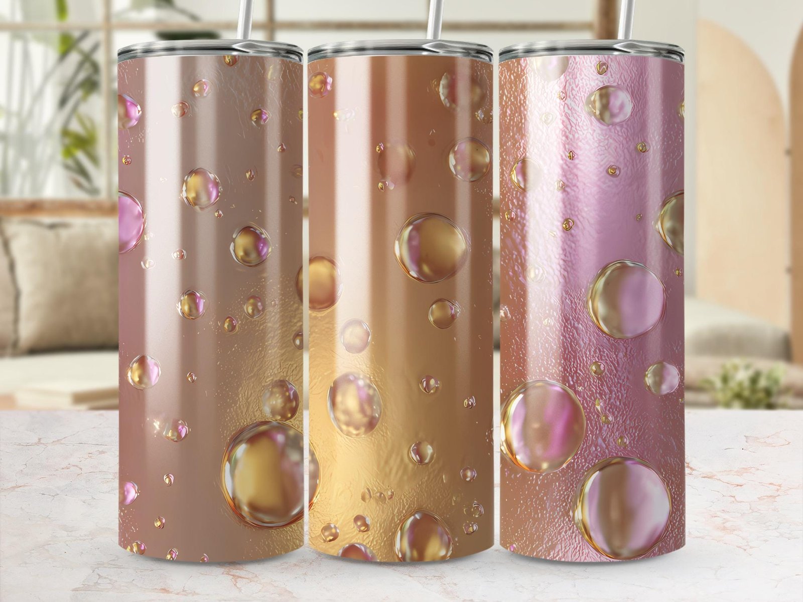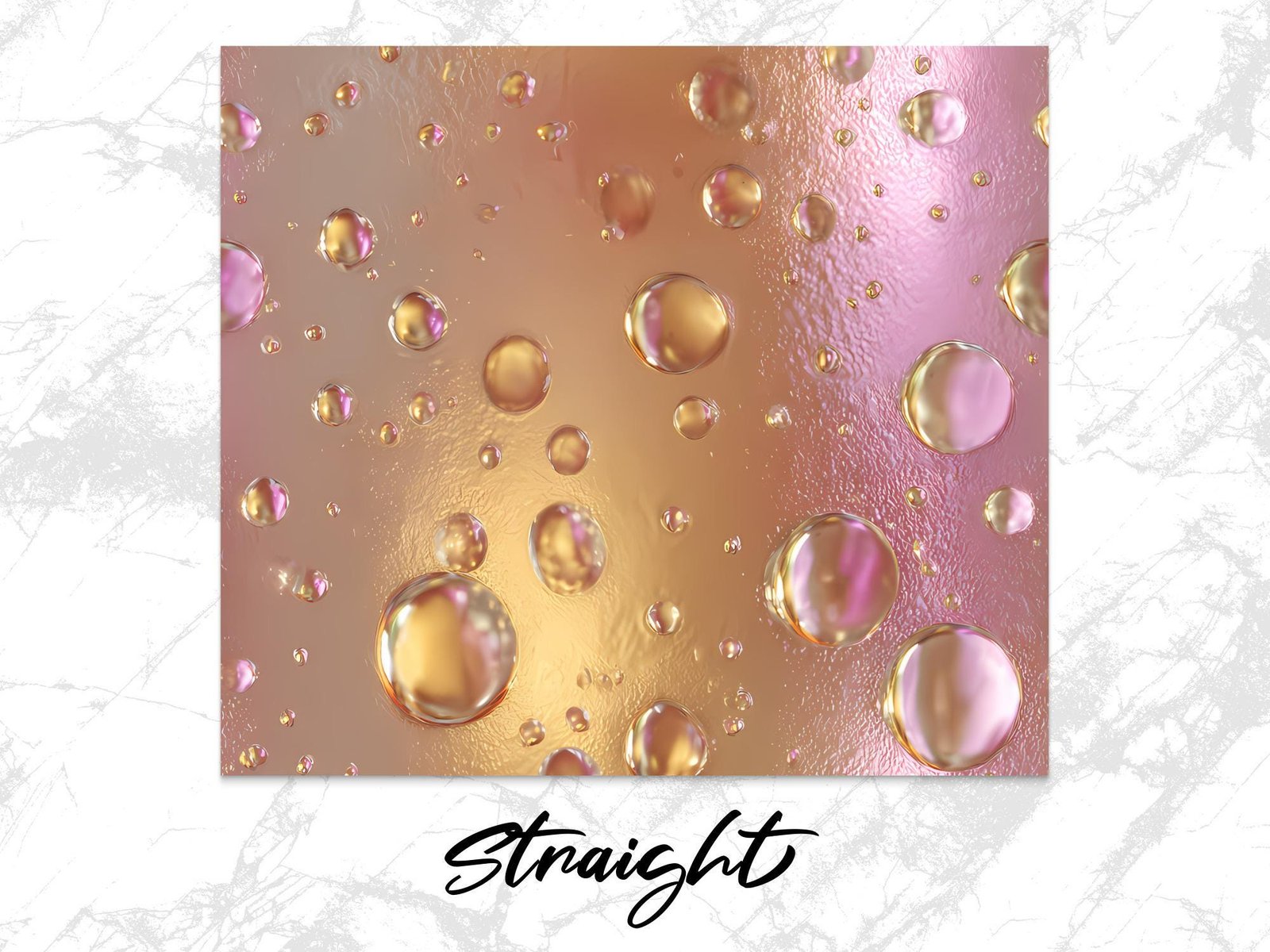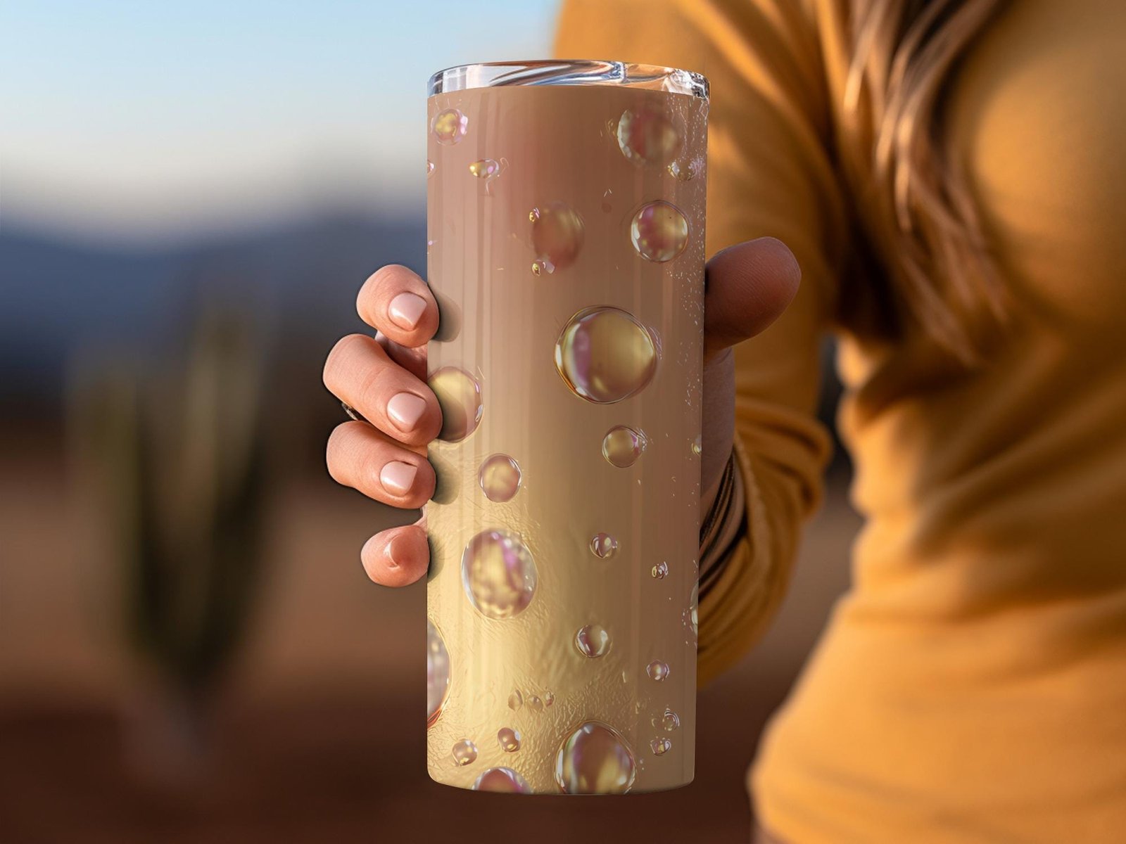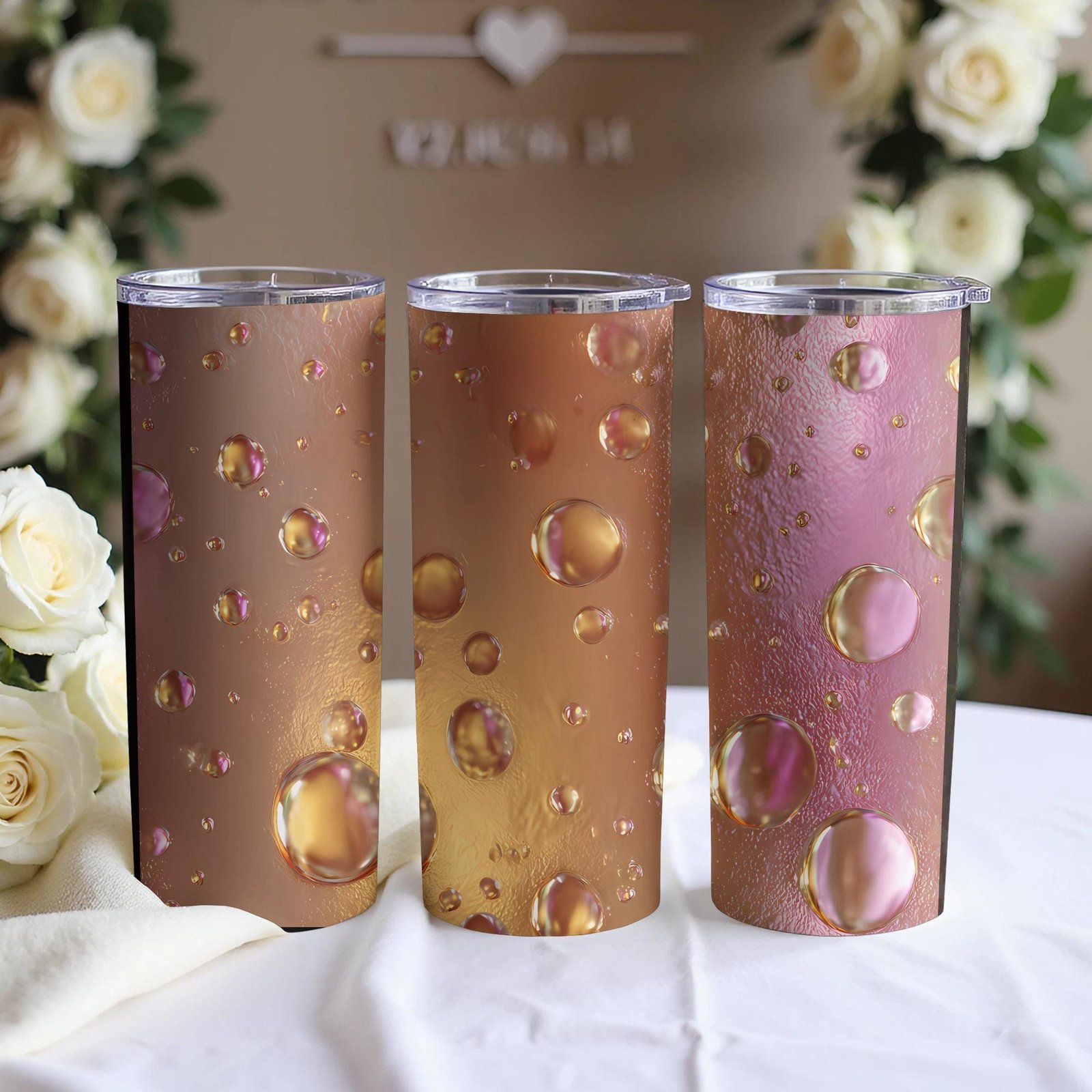 This listing is for a digital download of a high-resolution PNG file perfect for creating a 20 oz skinny tumbler wrap. The design features an abstract pattern of shiny, translucent bubbles in shades of gold and pink against a textured background. Add a touch of modern elegance to your drinkware.