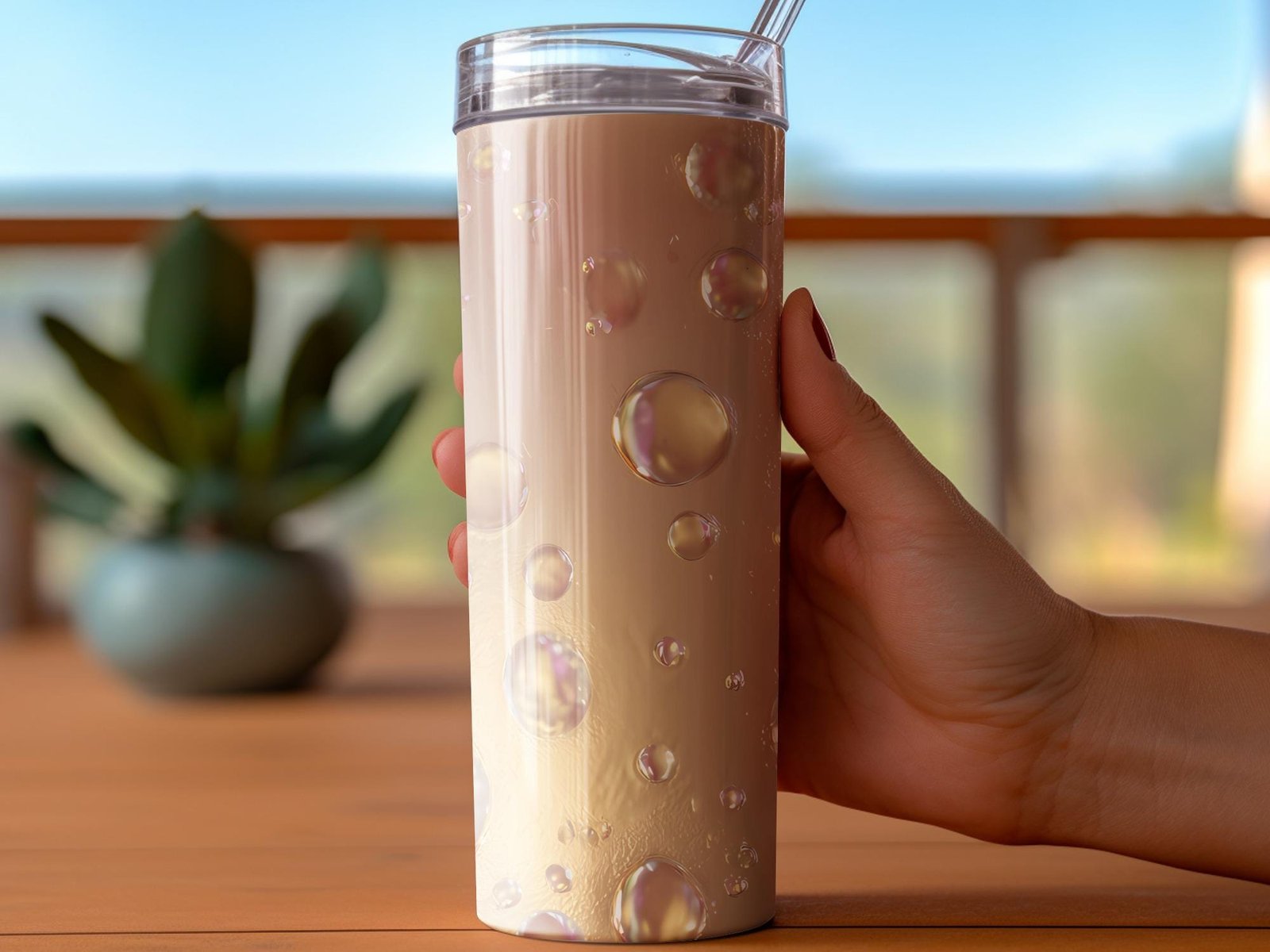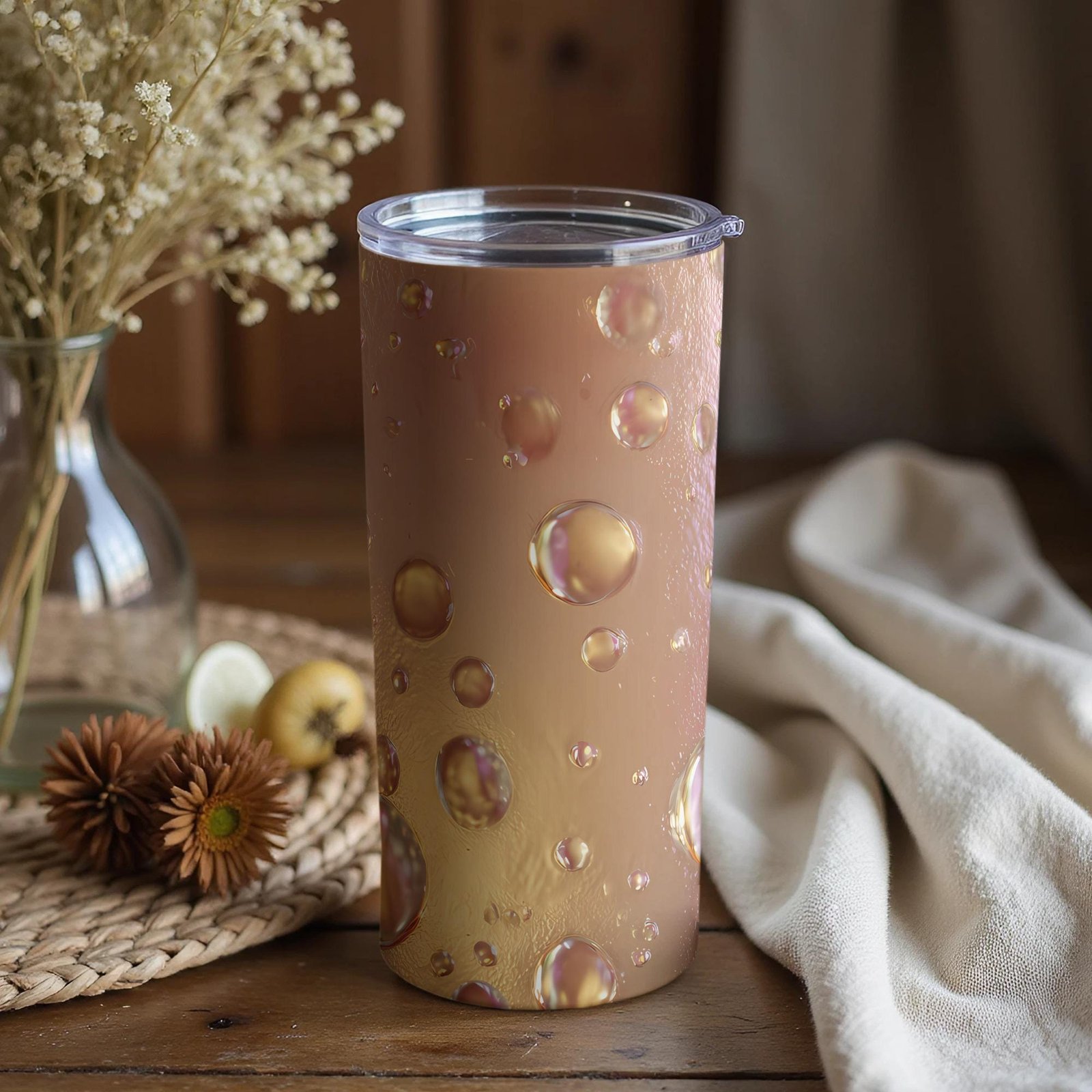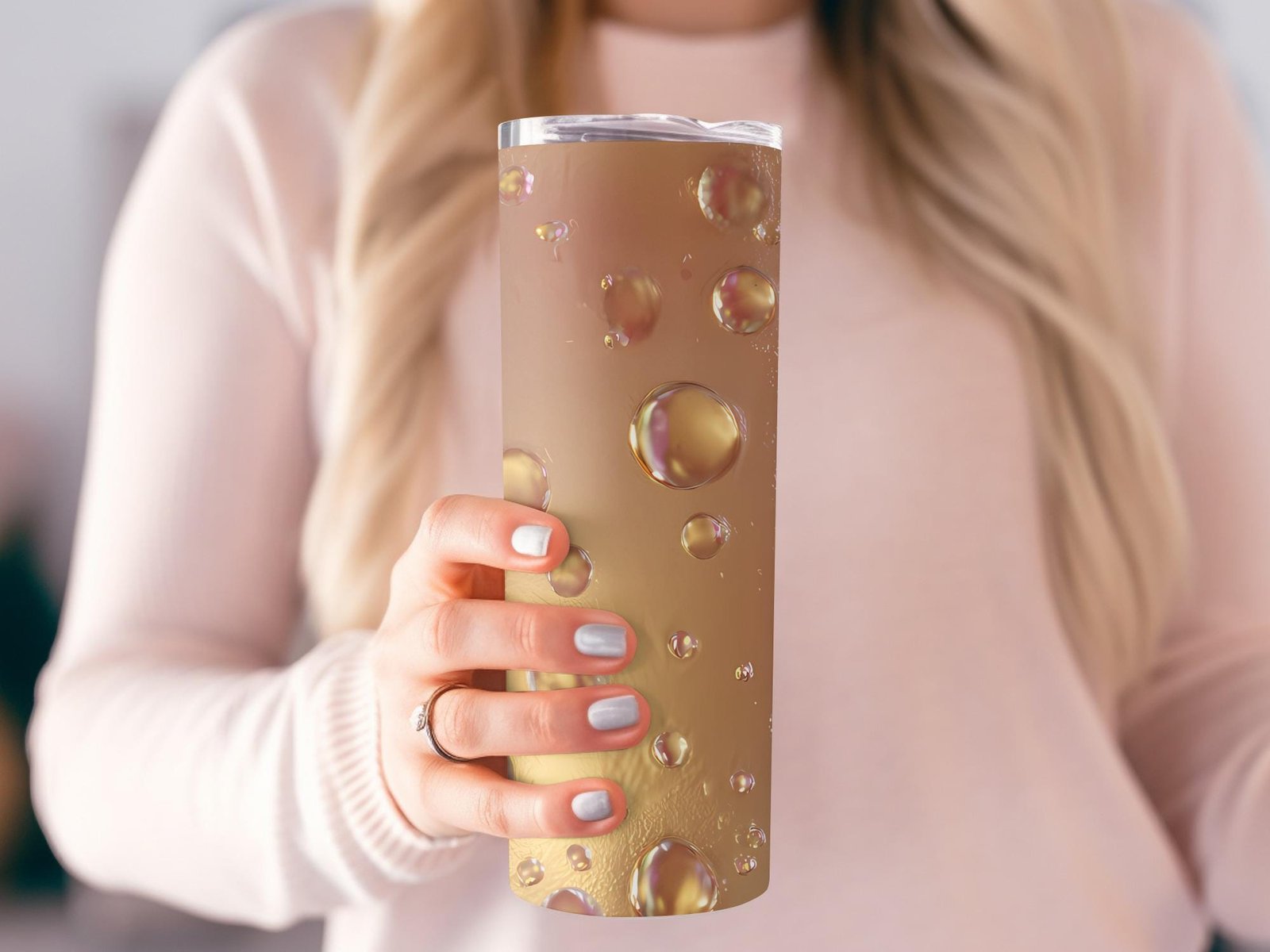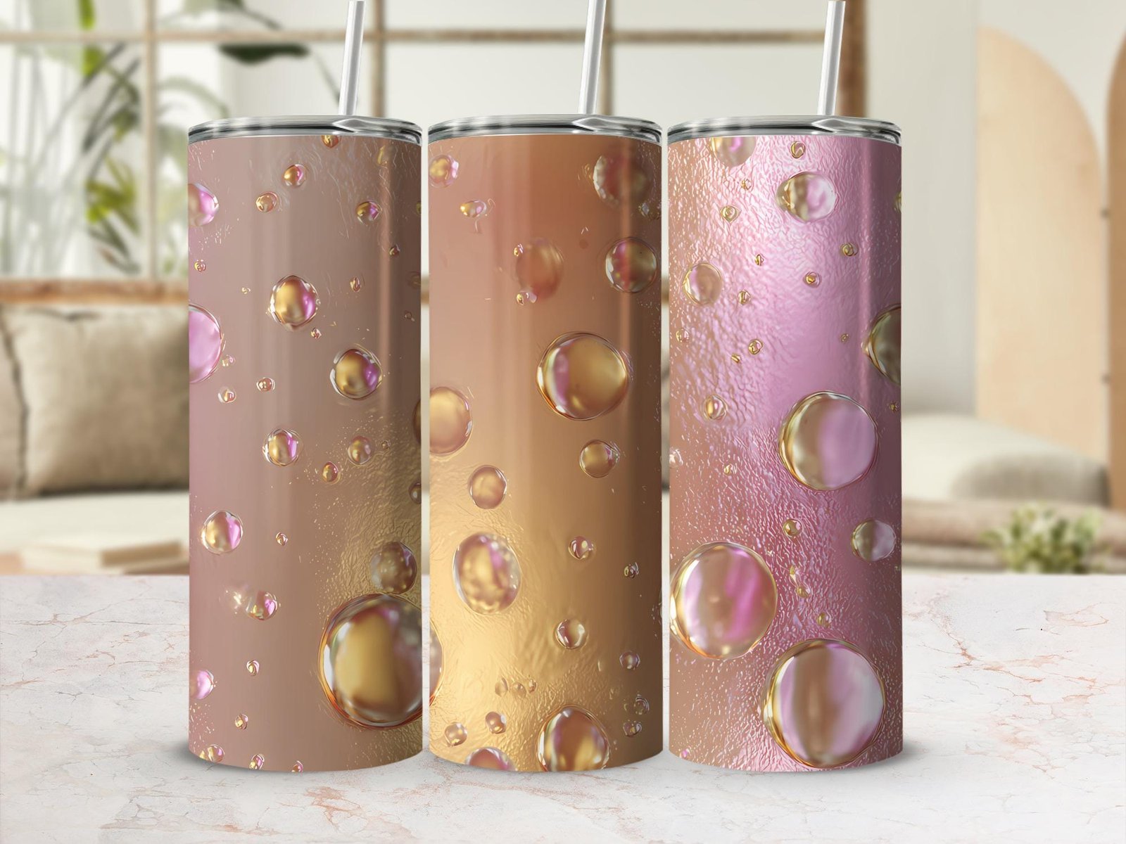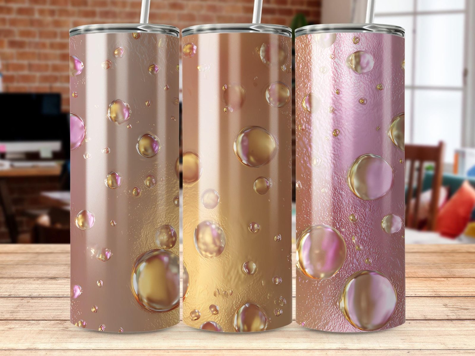 This listing is for a digital download of a high-resolution PNG file perfect for creating a 20 oz skinny tumbler wrap. The design features an abstract pattern of shiny, translucent bubbles in shades of gold and pink against a textured background. Add a touch of modern elegance to your drinkware.