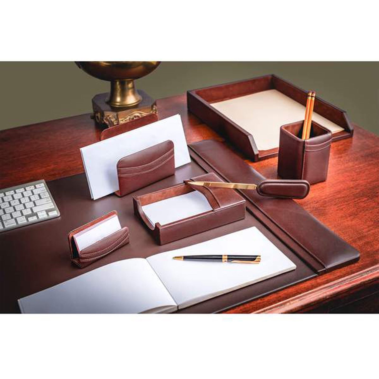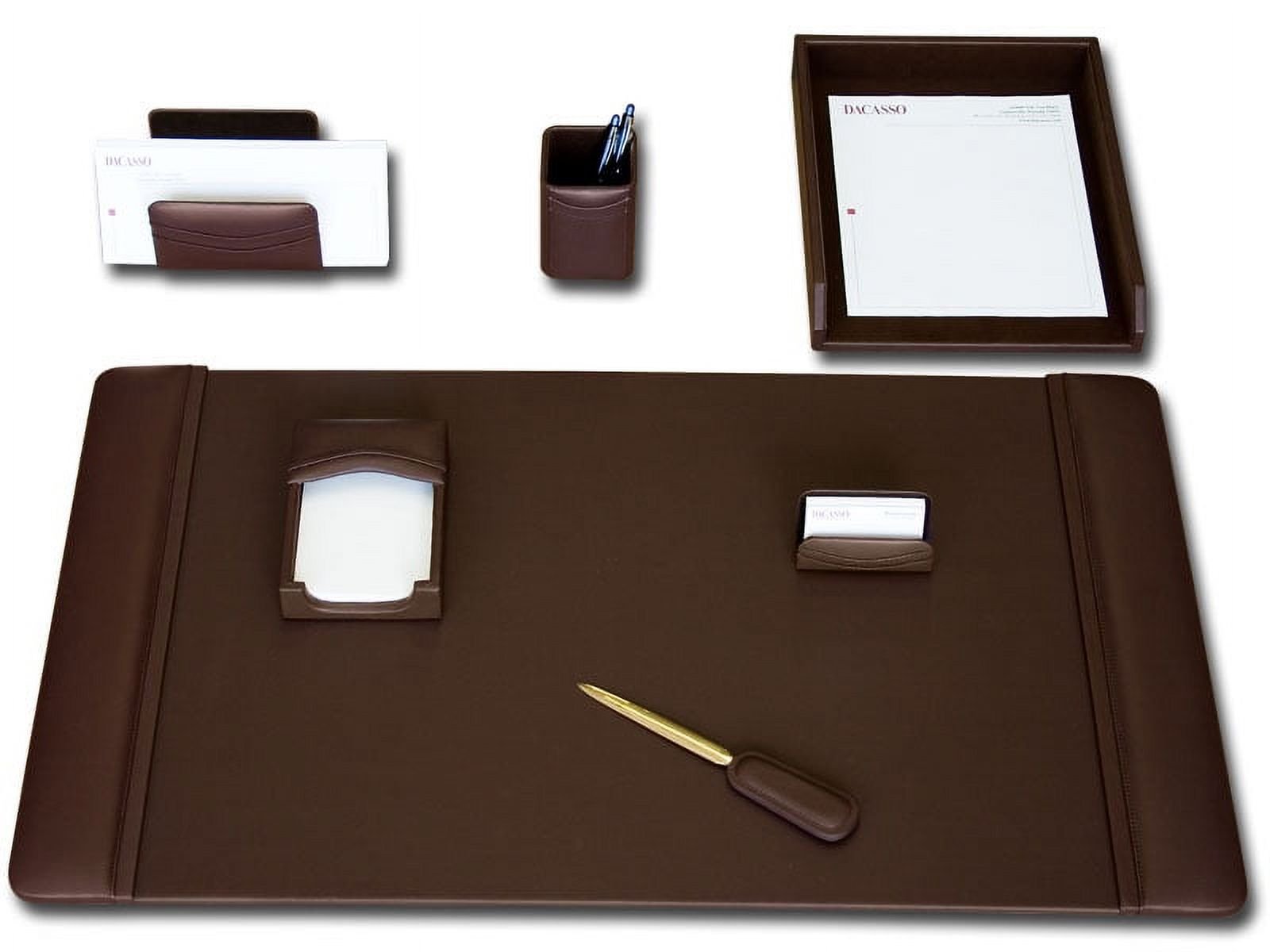 The perfect way to accessorize, protect, and organize your office in style. This complete desk accessory set contains everything you need to outfit your desk. All pieces are made in a luxurious top-grain leather with felt backing. The felt bottoms make all of the accessories safe for your desktop surface, no risk of scratching. This set includes: 34-inch by 20-inch desk pad with side rails, front-load letter tray, pencil cup, 4-inch by 6-inch memo holder, letter holder, business card holder, and letter opener. Make your desk the envy of the office with this beautiful matched set.Chocolate Brown Leather 7-Piece Desk Set