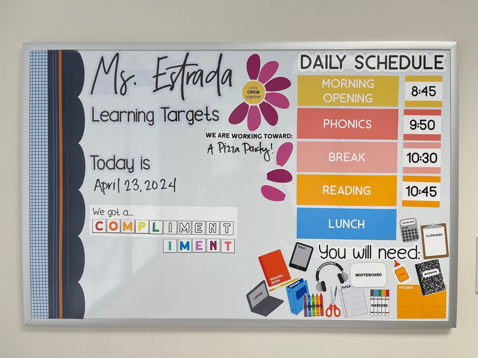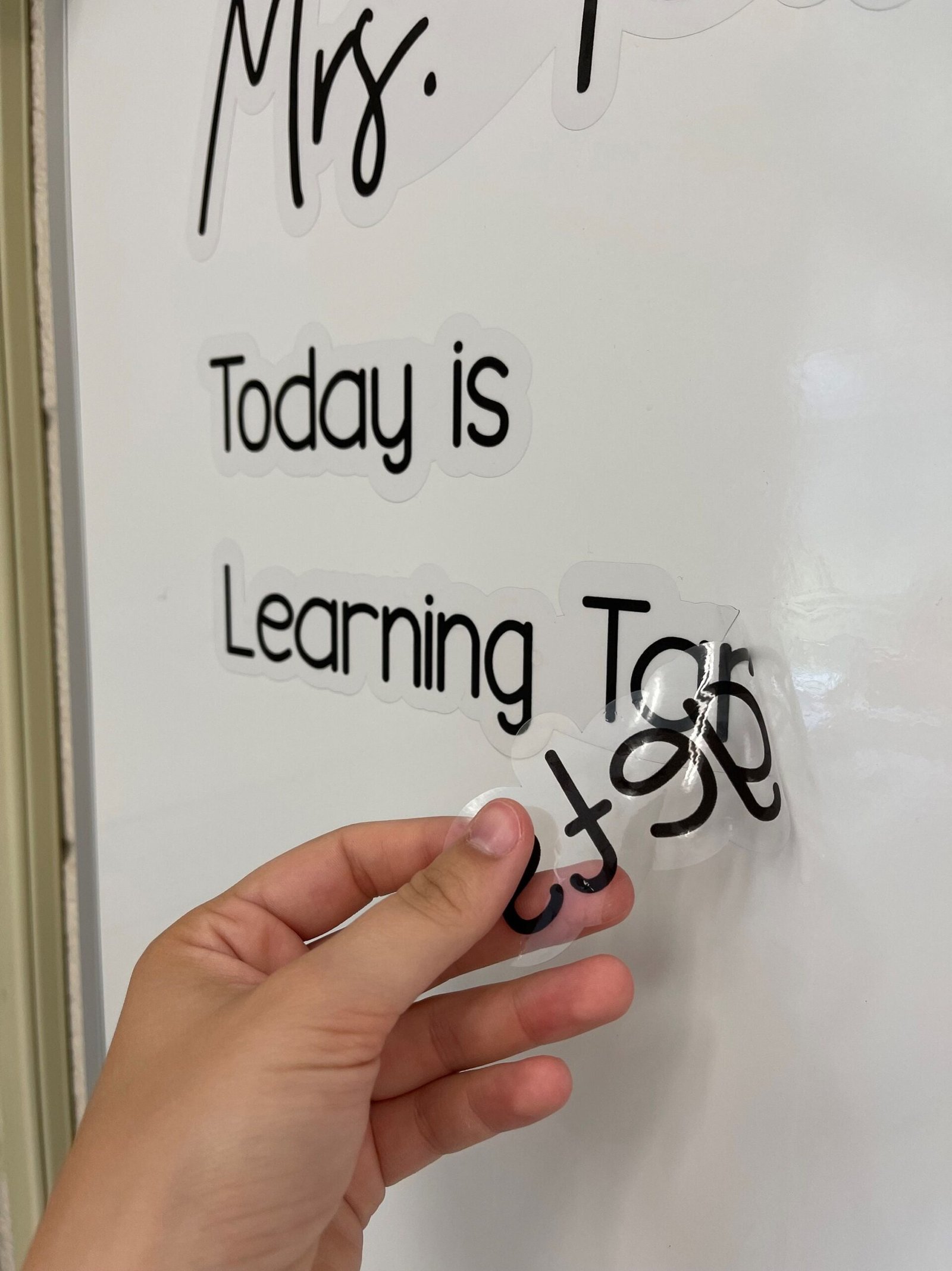 First, choose a size. How wide do you want the cling to be? The total width is based on the width of the Teacher Name cling. “Today is” and “Learning Targets” aren’t as wide see listing photo.