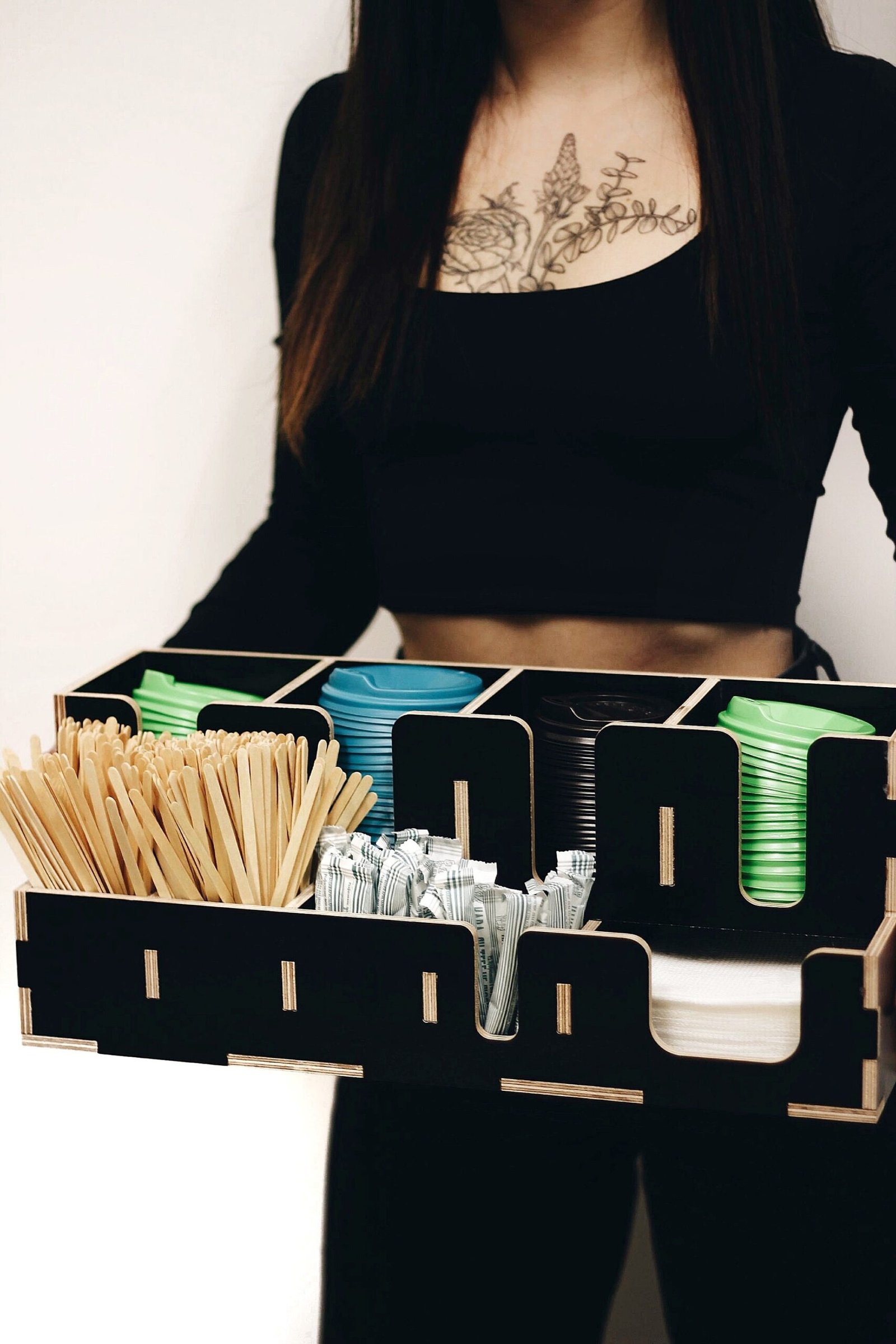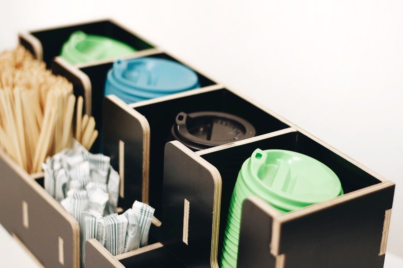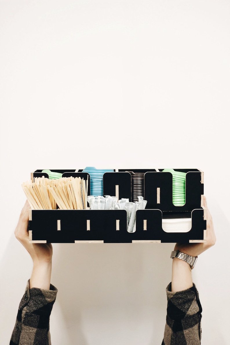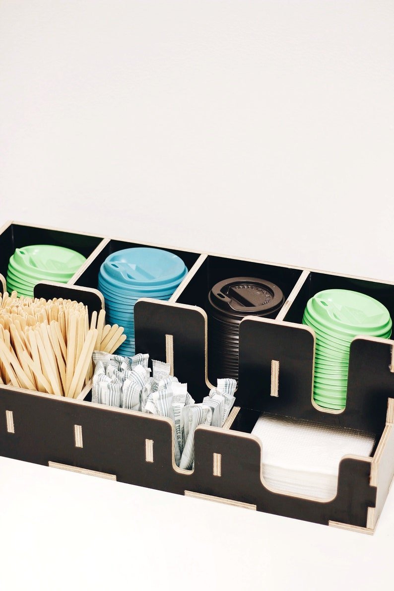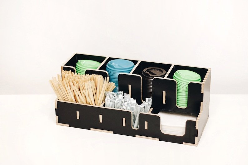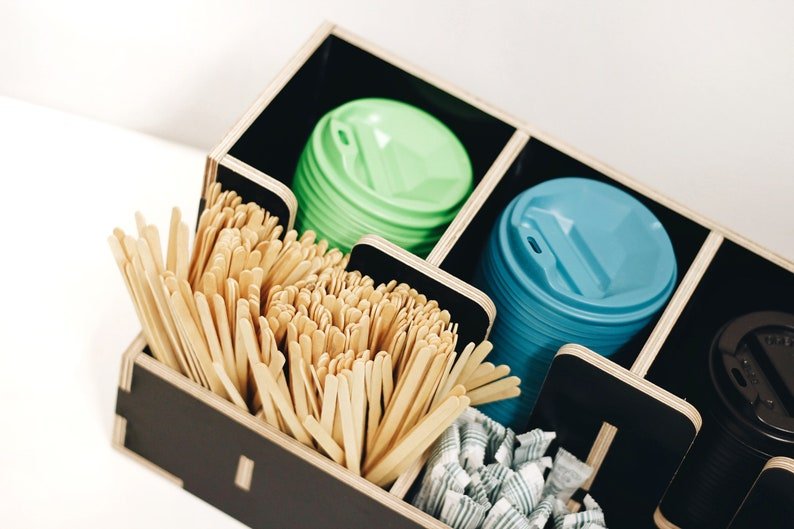 Coffee organizer for coffee house and coffee shop. Large wooden storage organizer box as coffee bar accessories
