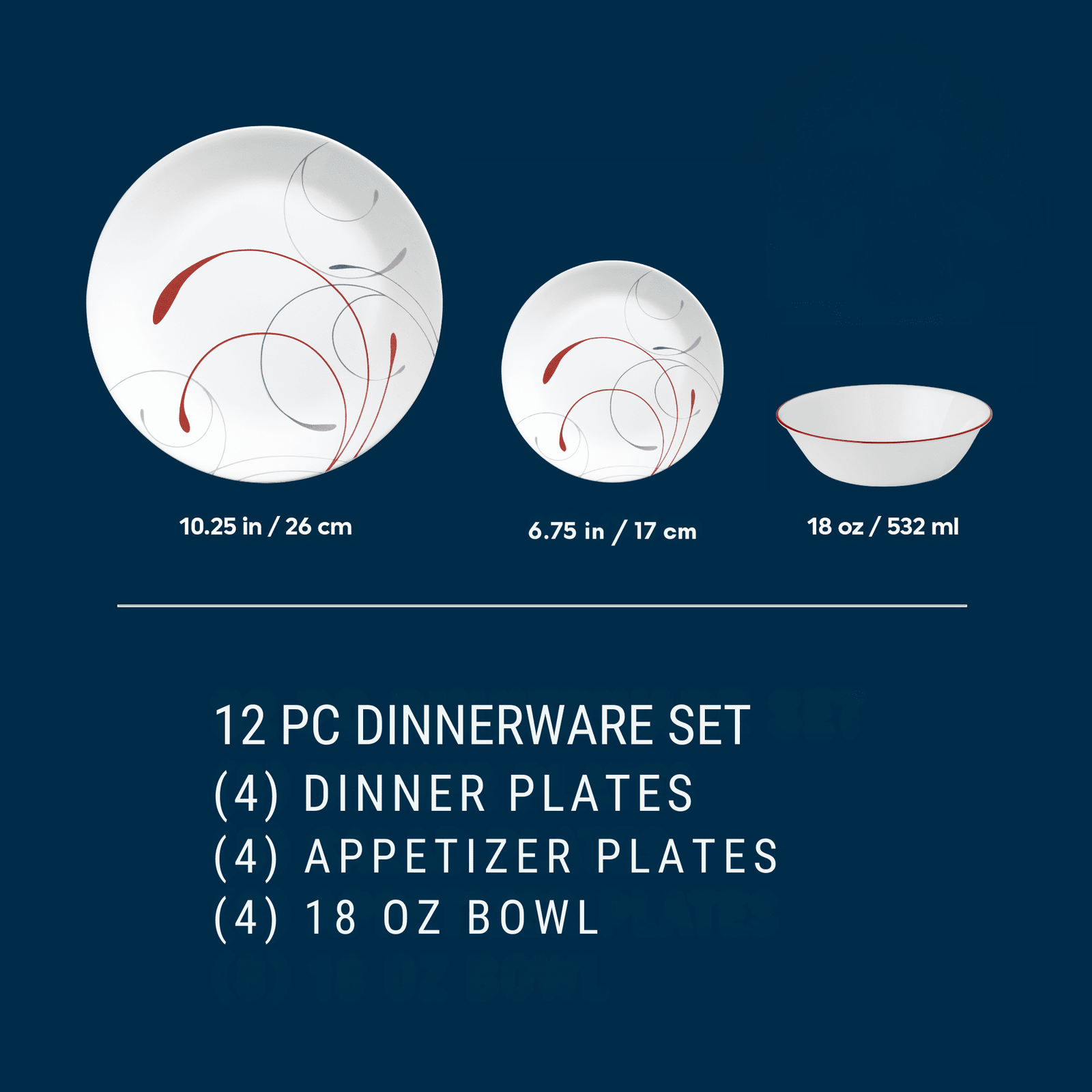 Adorned with plumes of soft gray and rich red, the Corelle Splendor 12pc dinnerware set brings splendid style to the table. The sleek round shapes have a classic look along with great durability, so they’ll embellish everyday meals and special occasions for years to come. These versatile plates and bowls are easy to care for, going from microwave to table to dishwasher with ease. The extra-strong, triple-layer Vitrelle glass is lightweight, super durable and easy to care for, so you can enjoy worry-free use every day. The ultra-stackable design also makes for easy transport and ideal storage within any sized kitchen. 12pc set includes: 4 10.25″ Dinner Plates, 4 6.75″ Appetizer Plates, and 4 18-oz Soup/Cereal Bowls.
