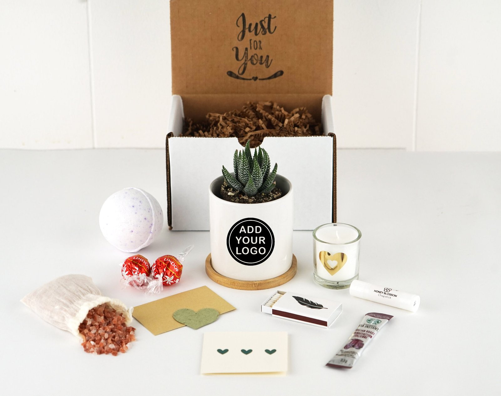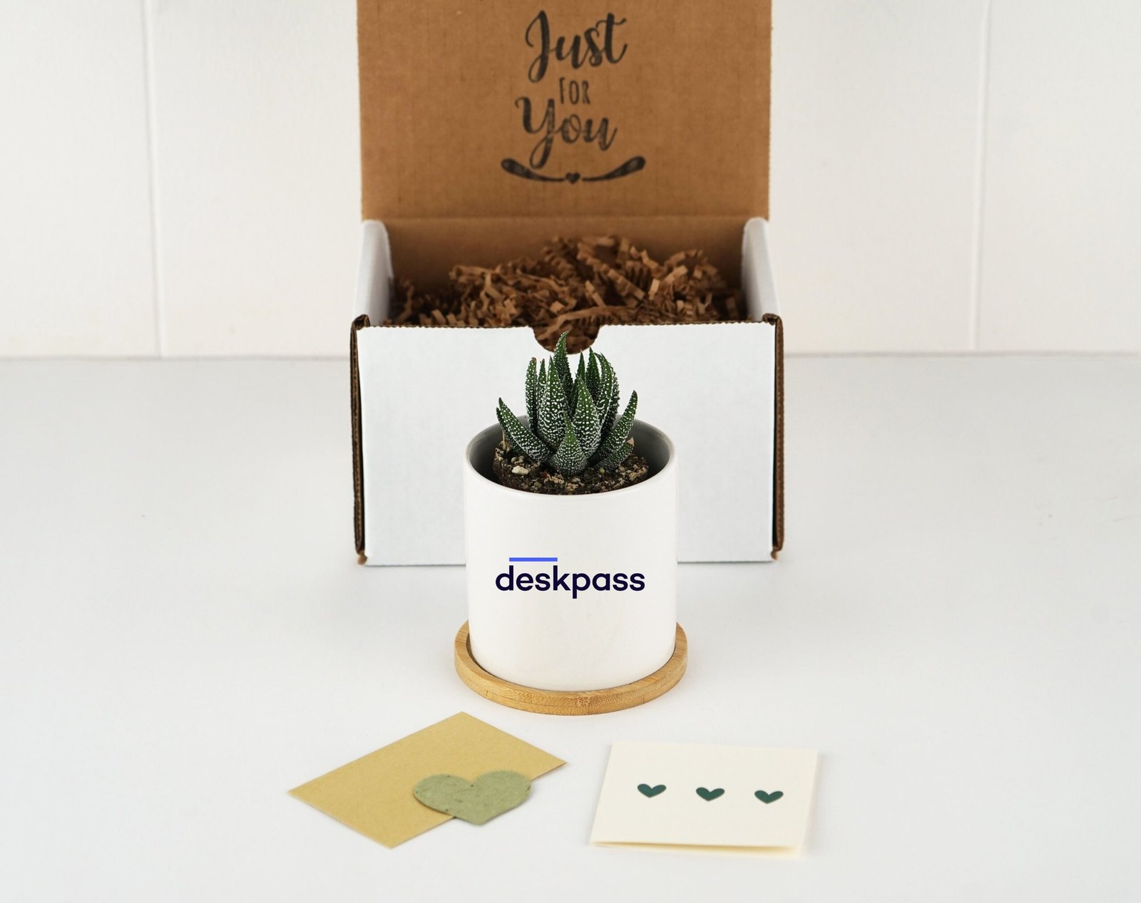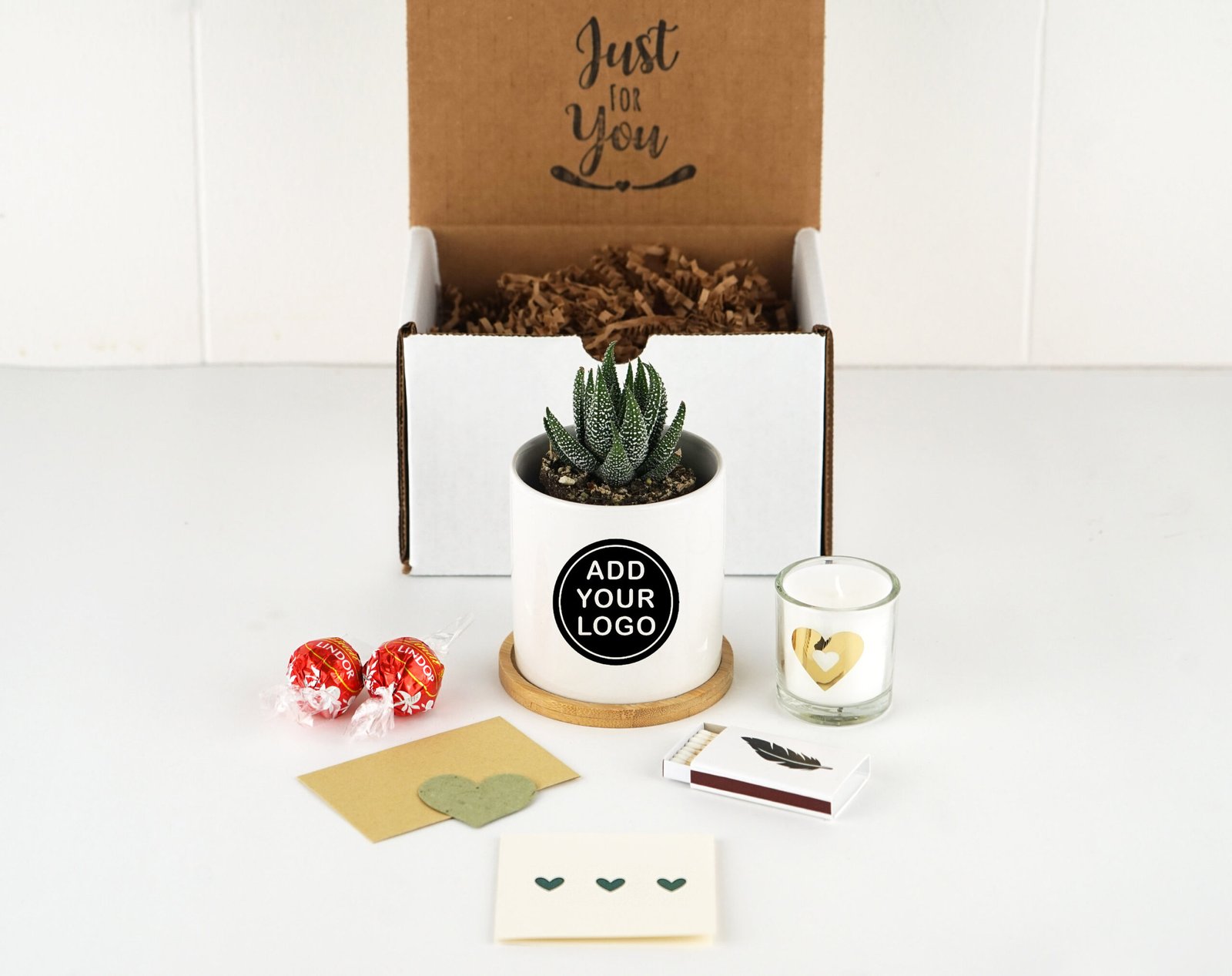 Corporate Gift Planter With Custom Business Logo – FREE SHIPPING – 3"e; Mini White Ceramic Pot w Tray – Holiday Gift – Employee Gifts