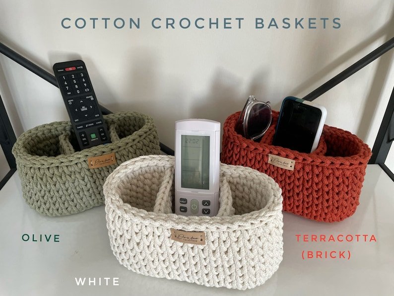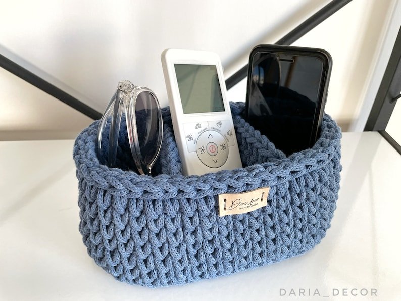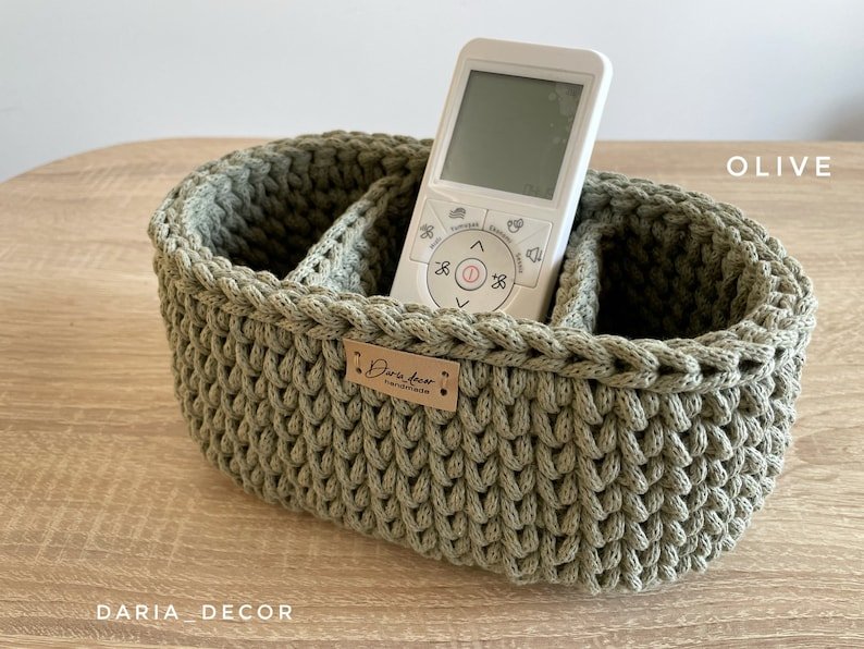 Cotton Crochet Oval Basket with Dividers, Remote Control & Eyeglasses Holder, Bedside caddy