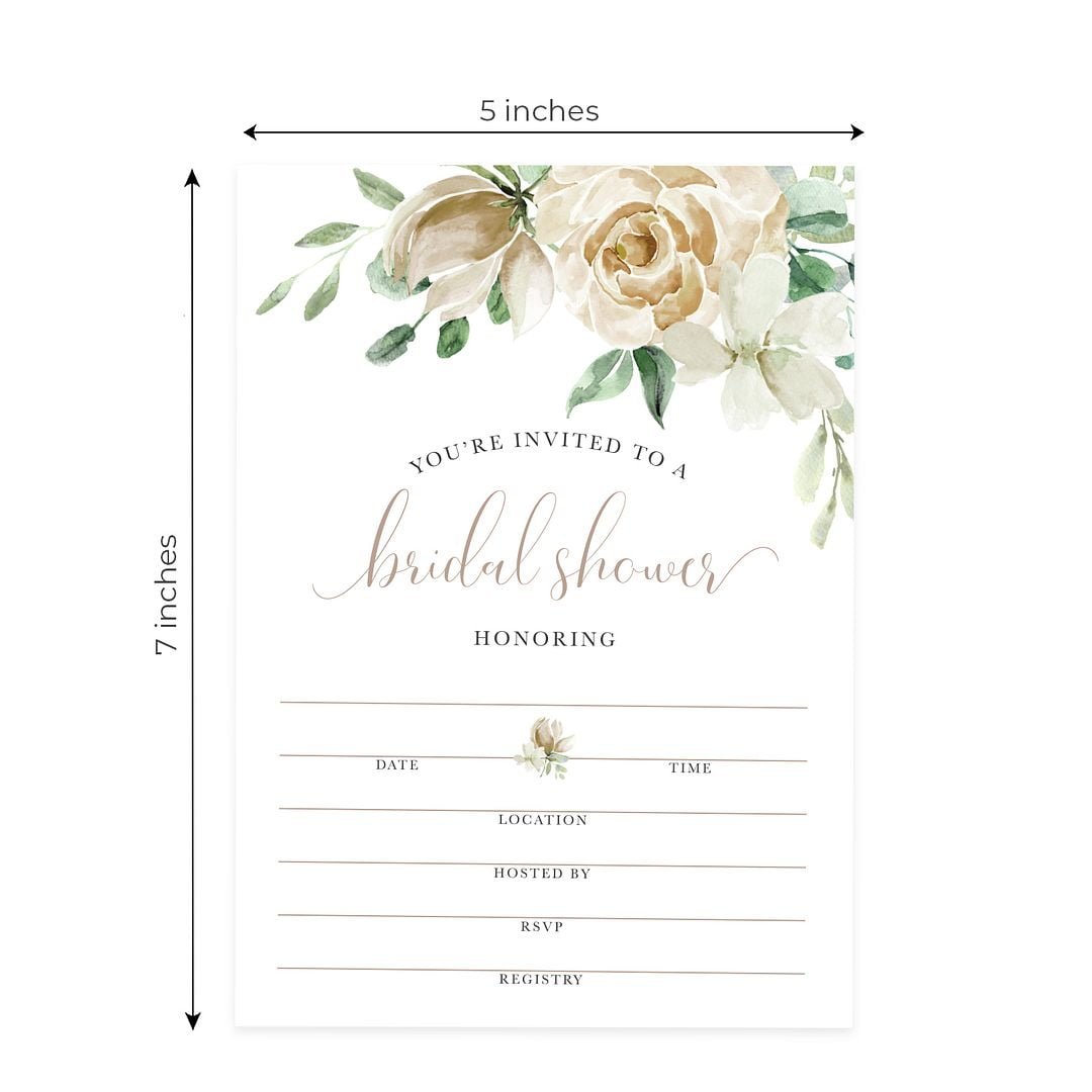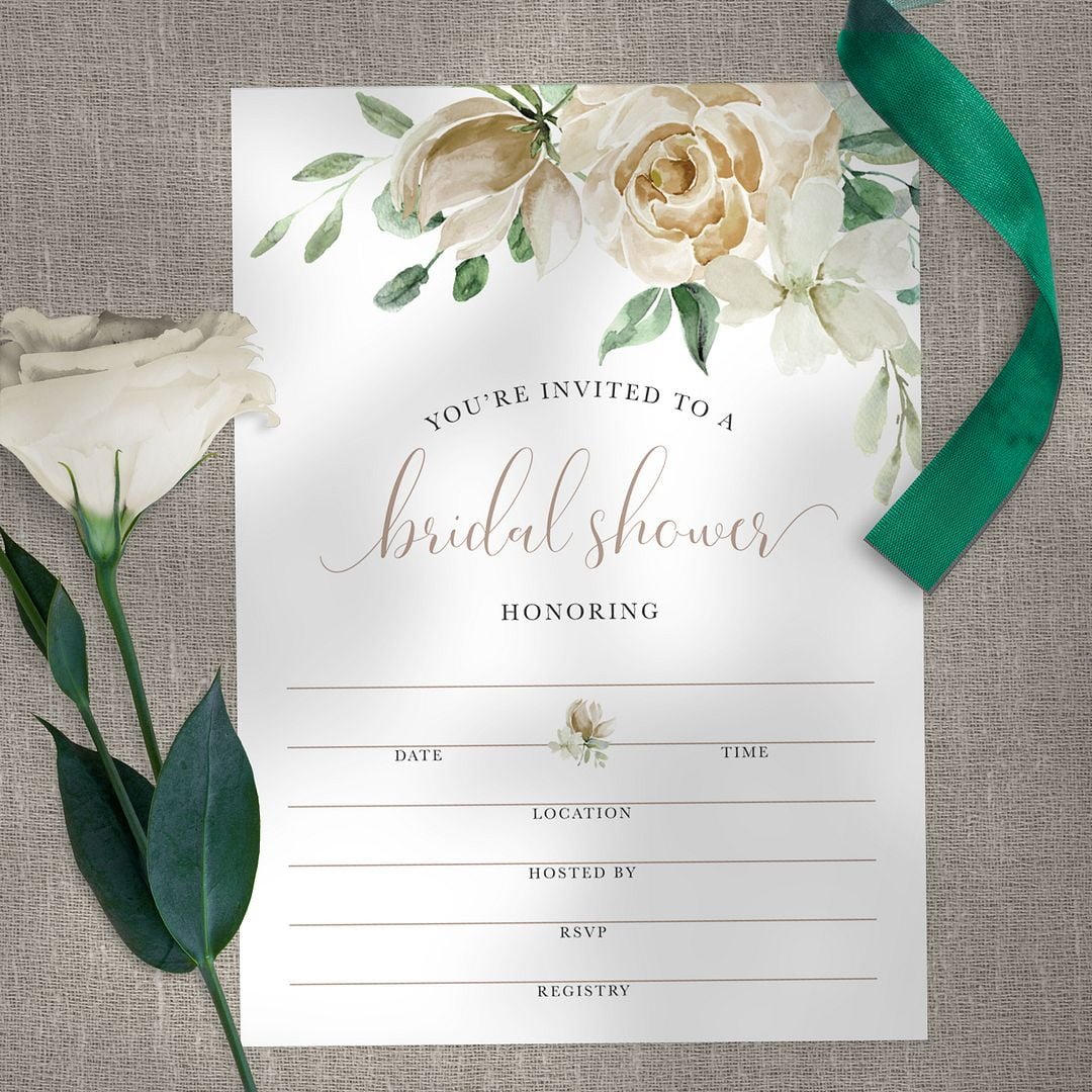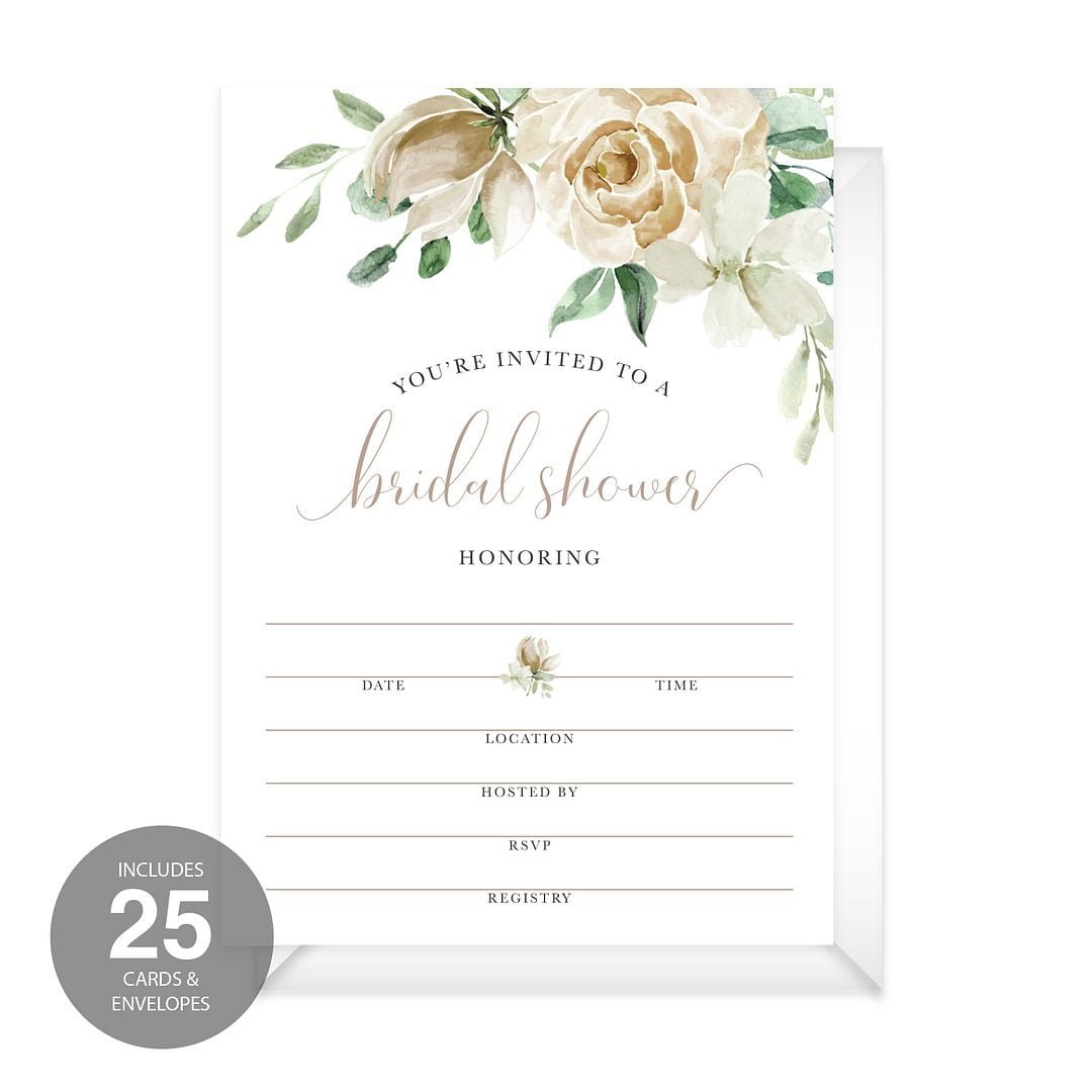 Cream Floral Fill-In Bridal Shower Invitation / Set Of 25 Cards With White Envelopes / Elegant Watercolor Invite