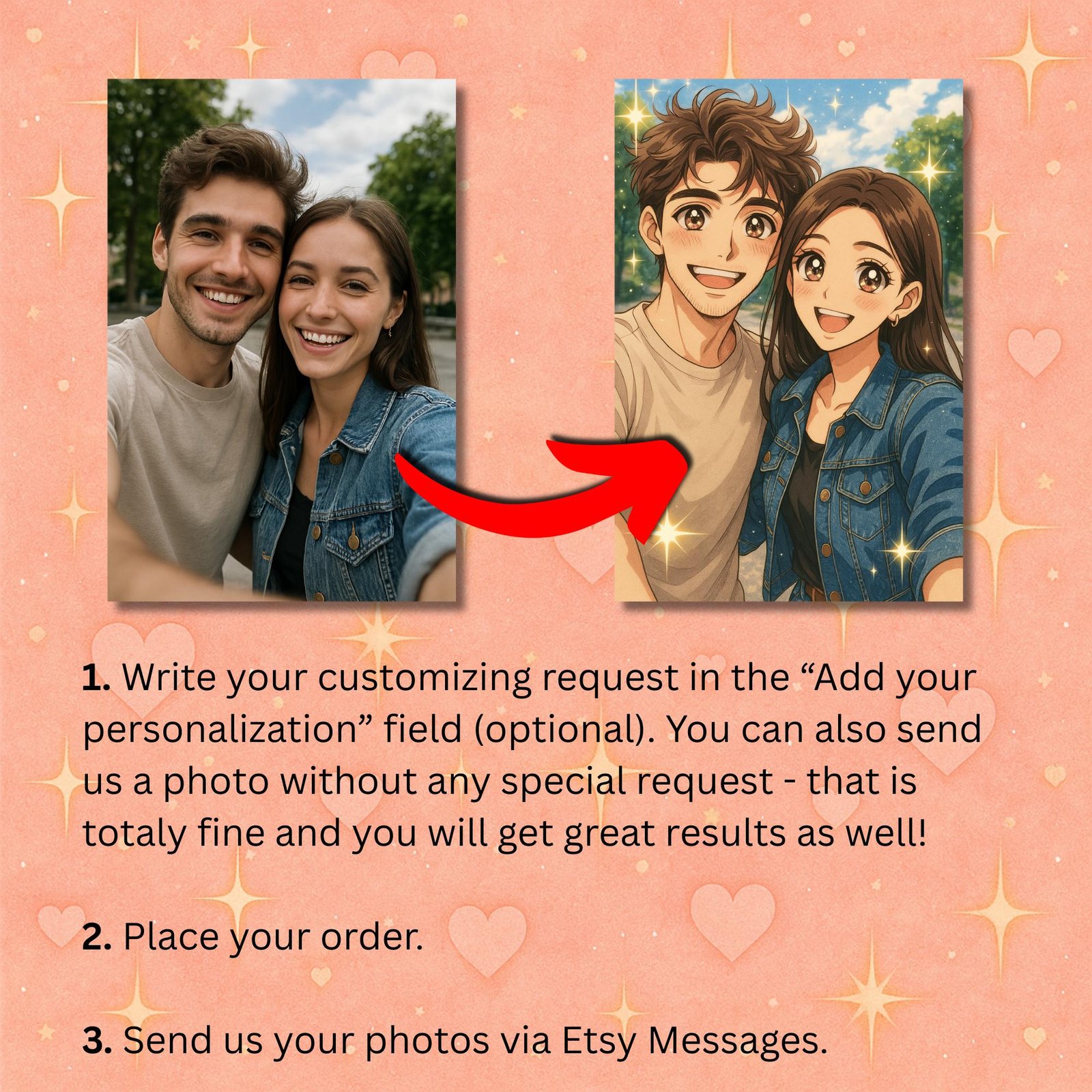 Whether it’s you, your partner, or your beloved pets – we’ll turn your favorite moments into magical anime-style art!