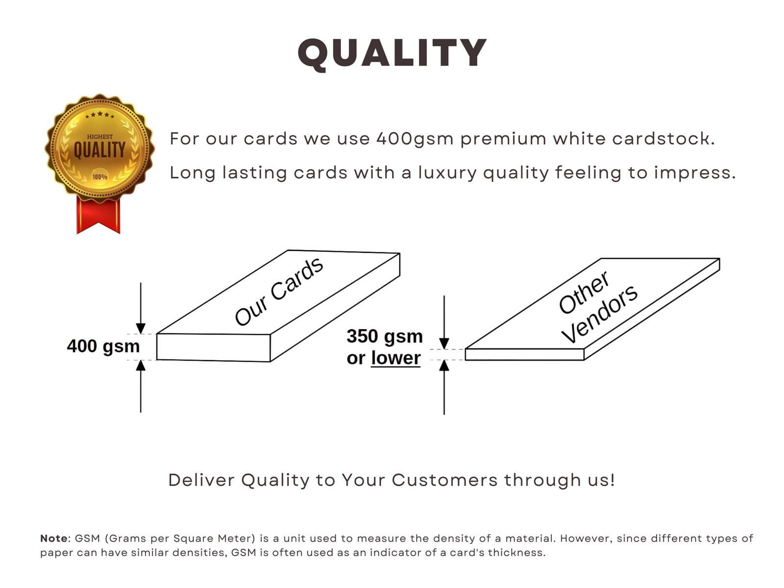 • Please note that each design requires a separate order. For example, if you purchase 100 cards, all 100 must feature the same design. E.g. We cannot split the order into 50 cards with one design and 50 with another. This policy applies to all products, including stickers, vouchers, postcards, and more.