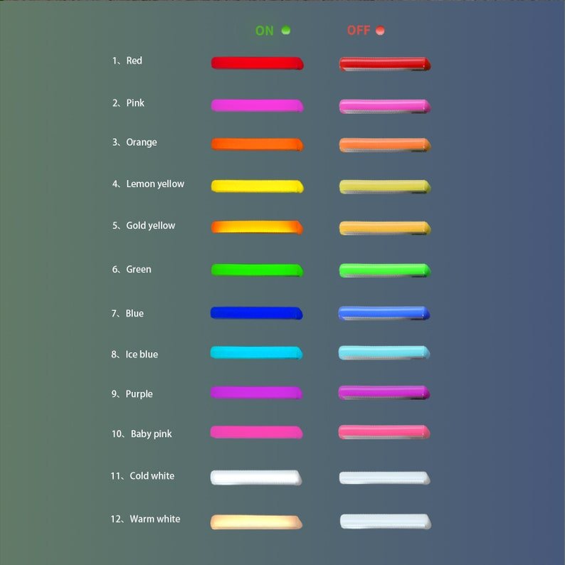 red ,pink ,orange ,lemon yellow ,gold yellow ,green ,blue ,ice blue ,purple ,cold white ,warm white ,baby pink |