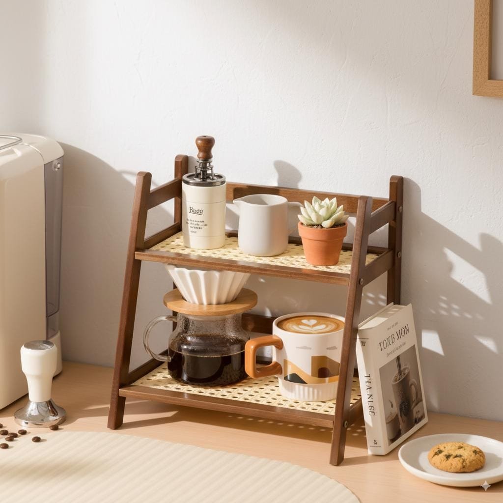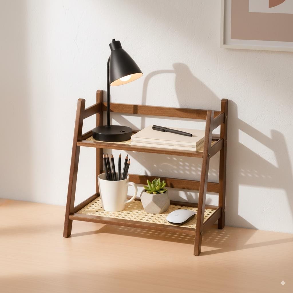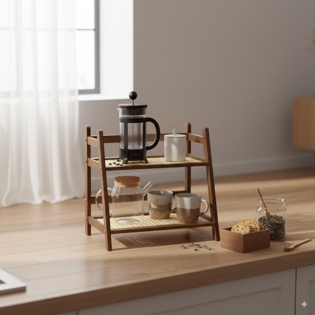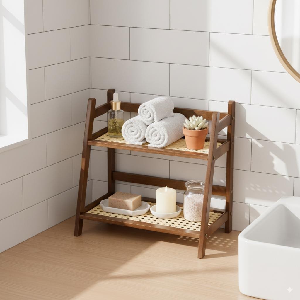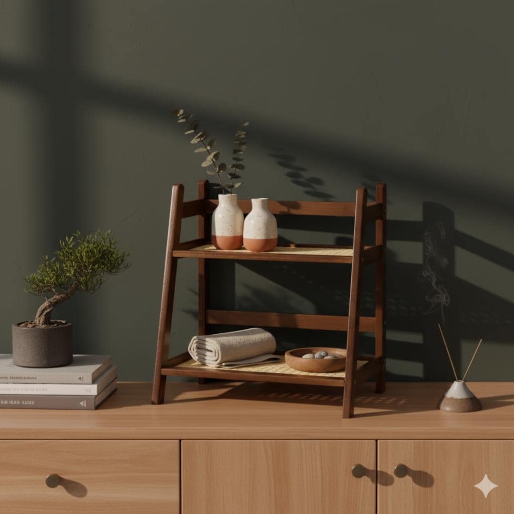 Dark Bamboo 2-Tier Shelf – Japandi Countertop Organizer for Bathroom & Kitchen, Small Wooden Storage Rack, Minimalist Home Decor