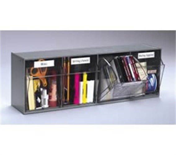 4 Unit, 24″ x 8″ x 6-1/2″, White Tilt Bin. The bins stay open, yet close with the touch of a finger. The storage bin unit is freestanding or wall mountable. These bins are ideal for the storage of numerous items, ranging from tools to toys.