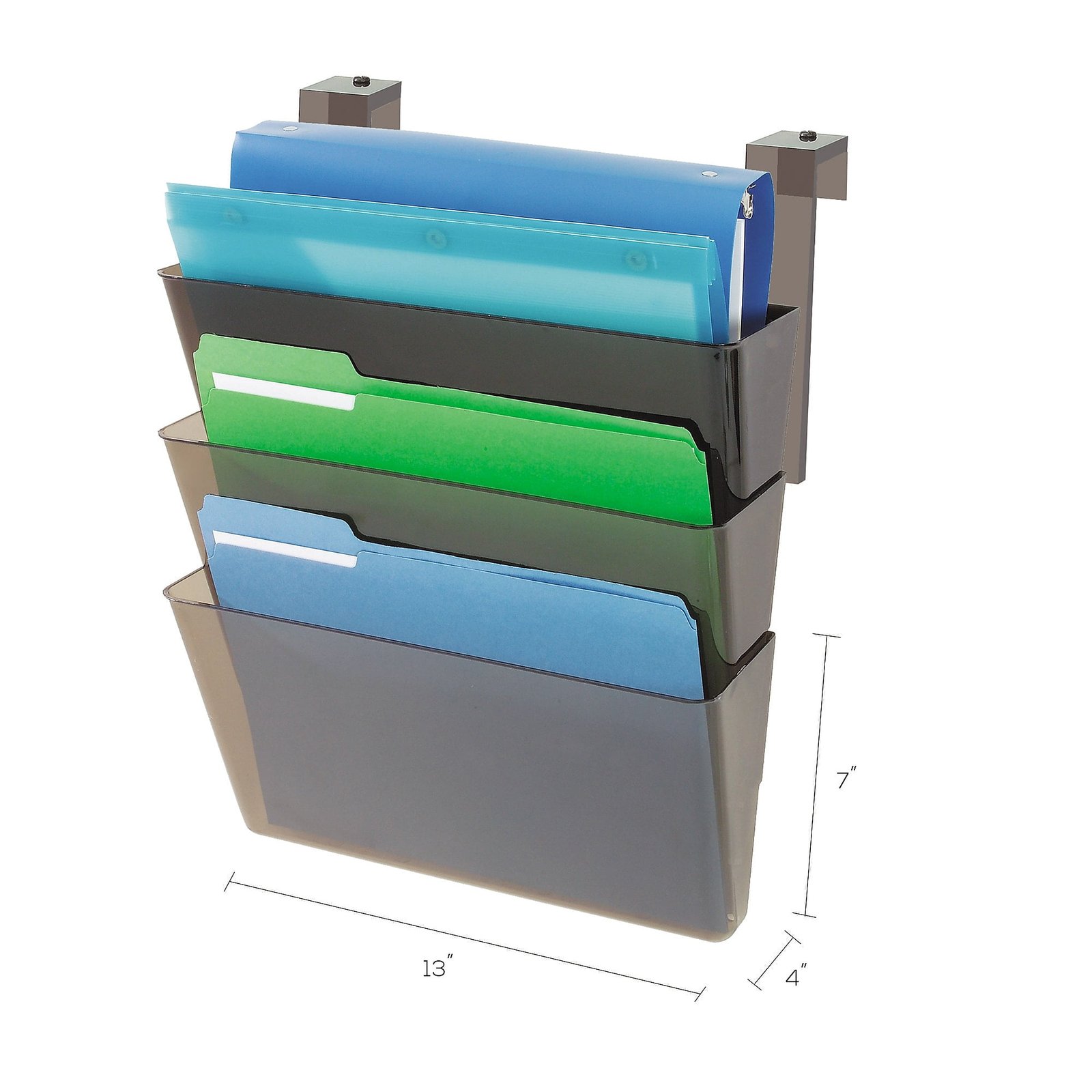 An essential tool for every office or cubicle, this attractive 3-pocket filing system moves papers off the desk, creates extra space and organizes your office. Its waterfall design provides visibility to many files at one time. Each pocket connects to one another with the included EZ Link linking pins, and attaches to the adjustable partition brackets with hardware provided. Each pocket accommodates letter-size documents and files and is great for large workloads. Durable construction for long-lasting use. Partition brackets adjust to 2.5 in. wide for most wall panels. Also wall mountable hardware included.