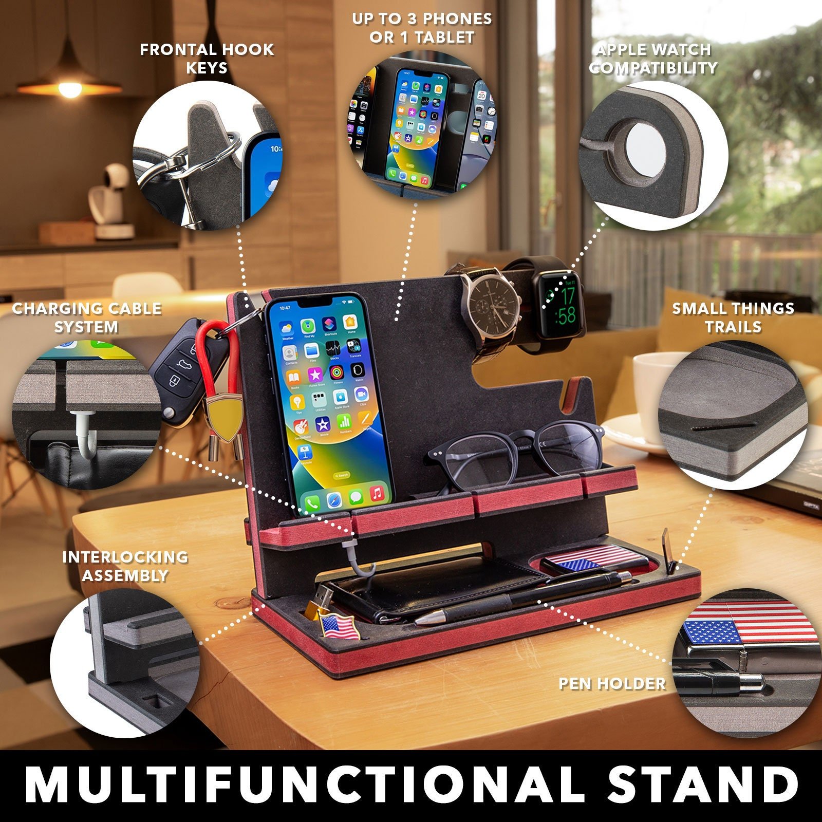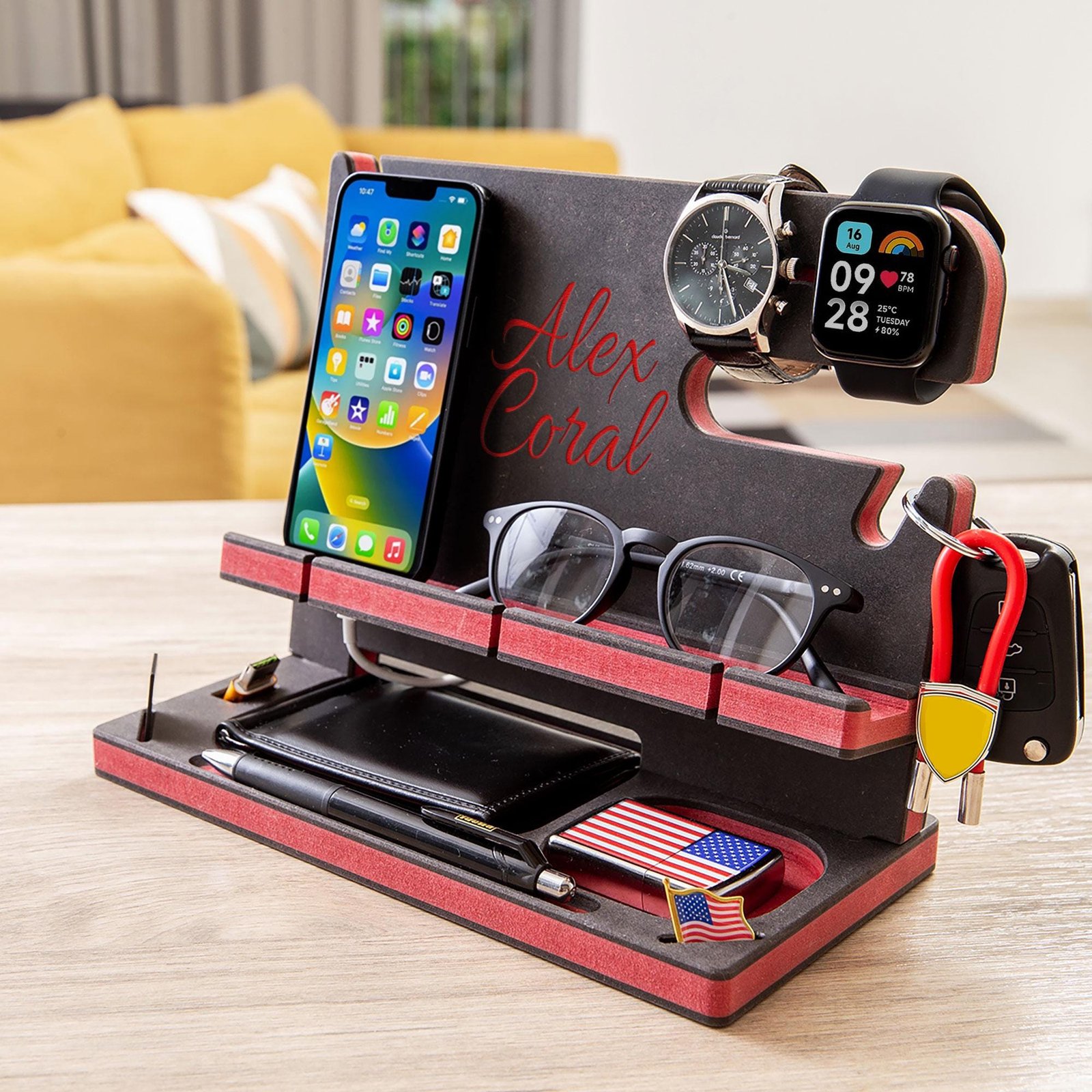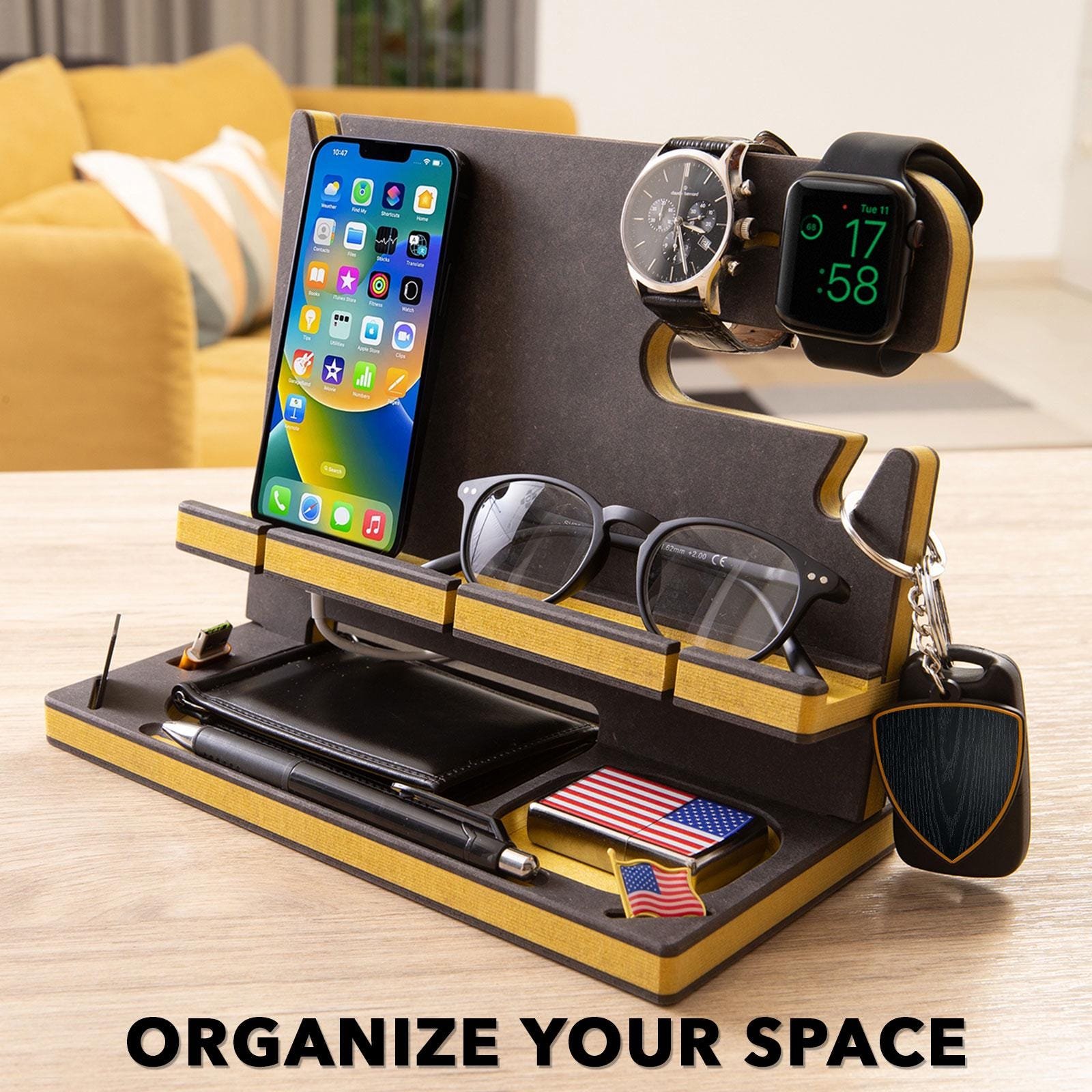 Desk Organizer, Wood Personalized Docking Station for Cell Phone, Tablet,Wallet, Essentials,Storage Stand Work Desk,Nightstand,Gifts for Men